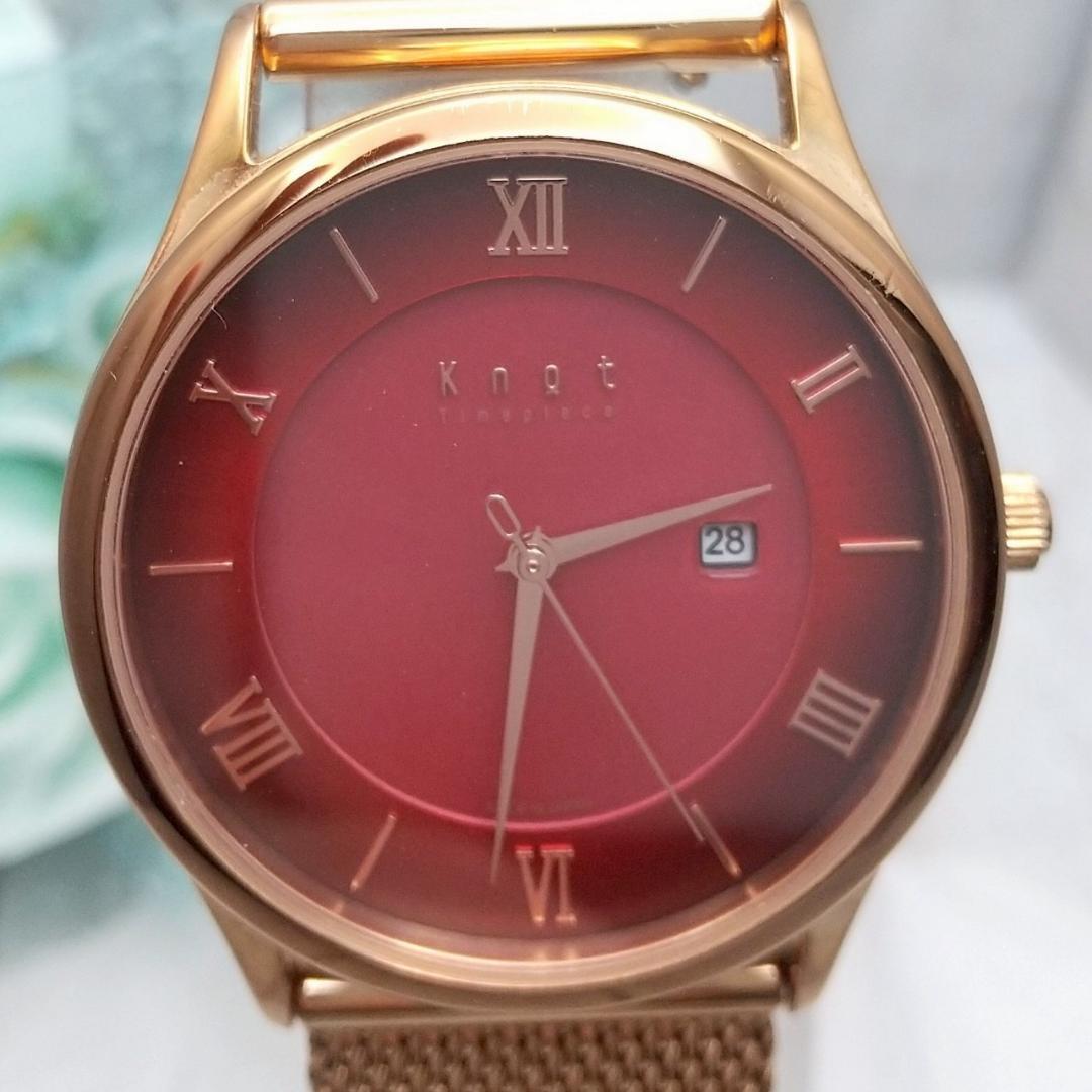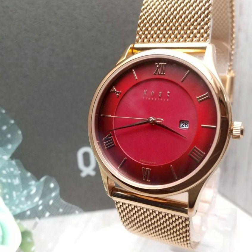 深みがかった赤の文字盤にデイト機能が付いたノットのレディース腕時計です。