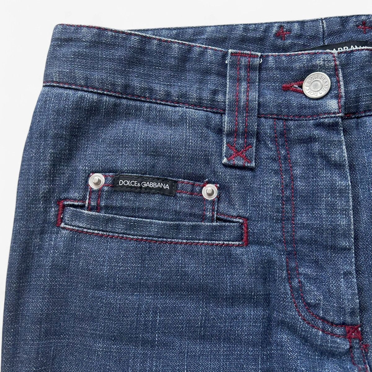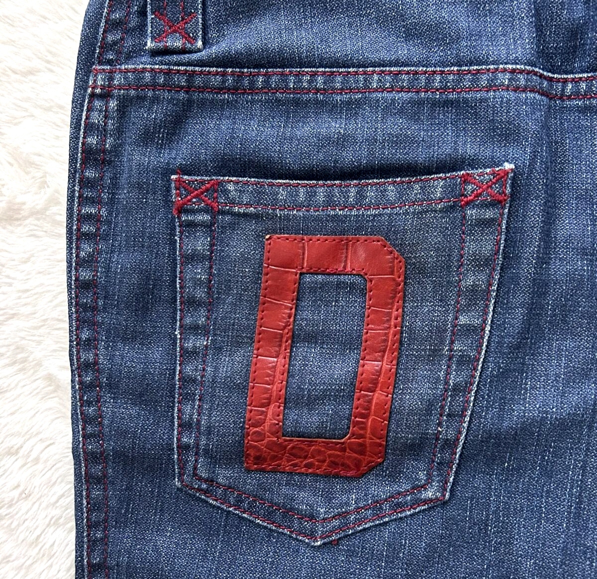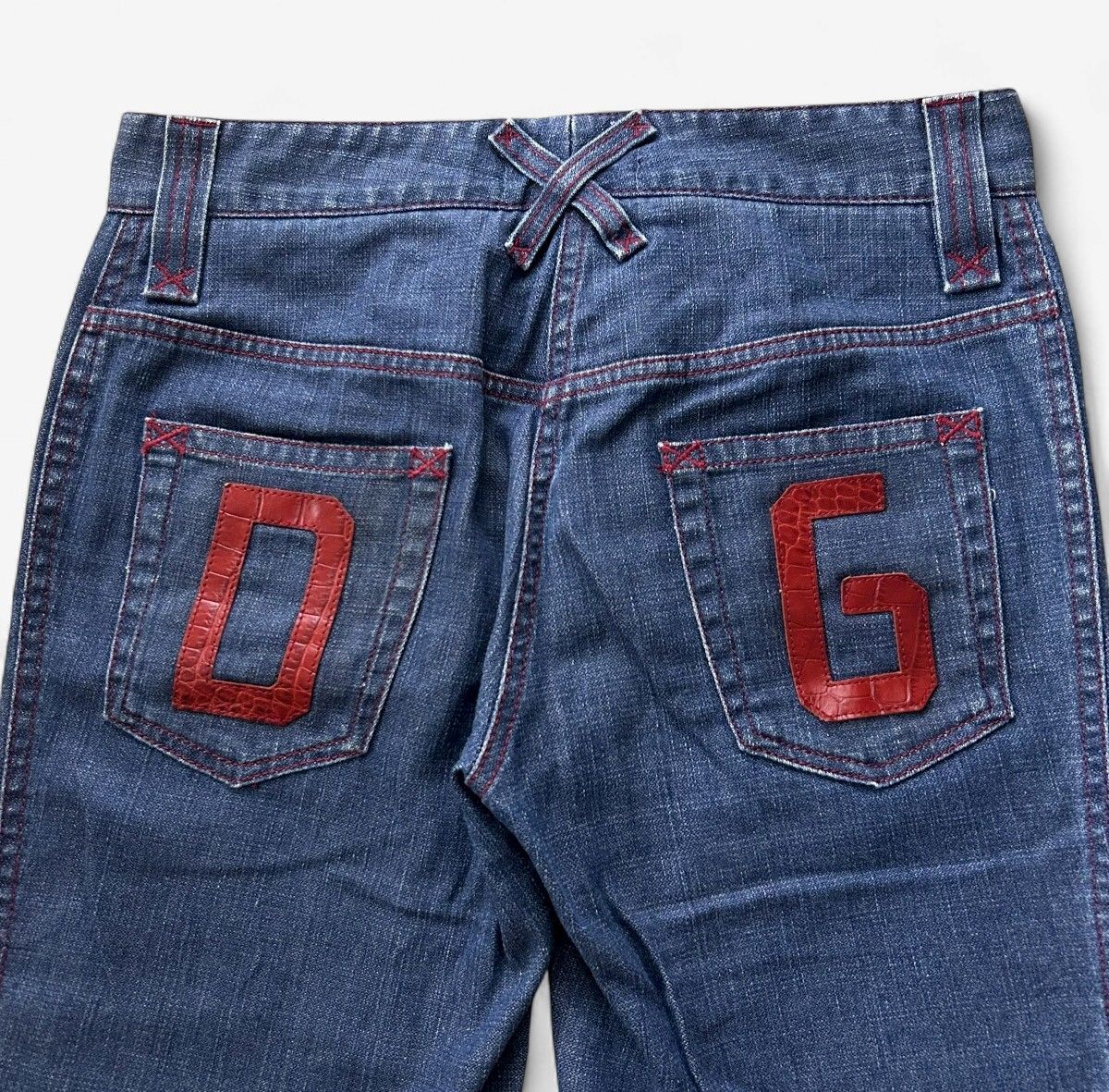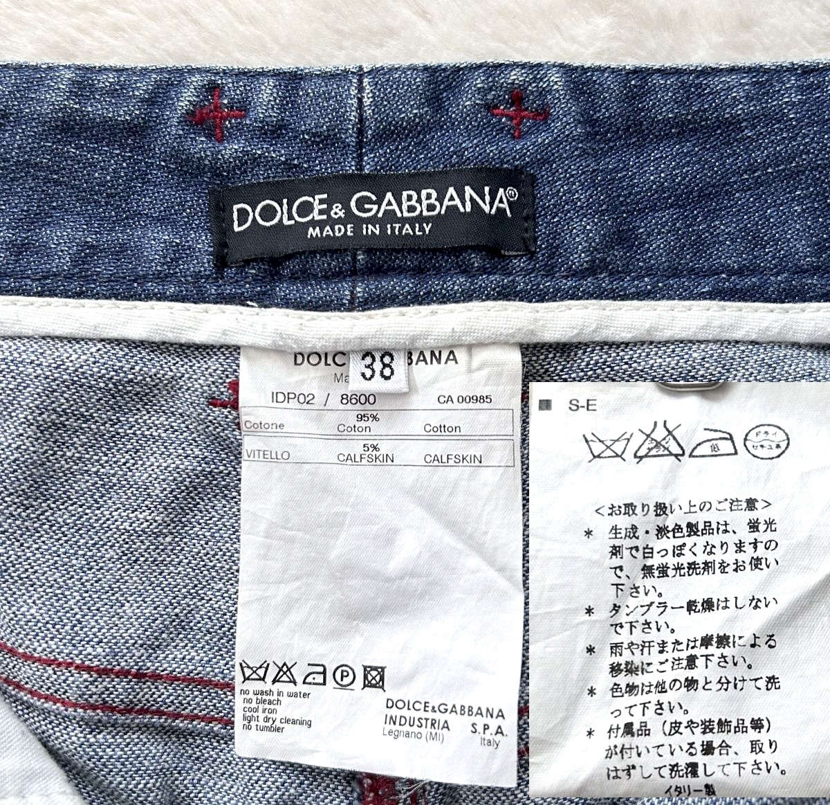 デニム地にレッドのステッチ、レッドの革パッチがお洒落な配色で、一目でドルガバと分かるデザインです。