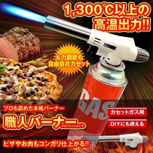 簡単で高性能なお手軽トーチバーナーです。片手でワンタッチ点火、炎の強さも形も自在に調節できる高性能 ガスバーナーです。最大火炎温度は約1300℃で、素材の旨みを逃がさず短時間で美味しく仕上げます。