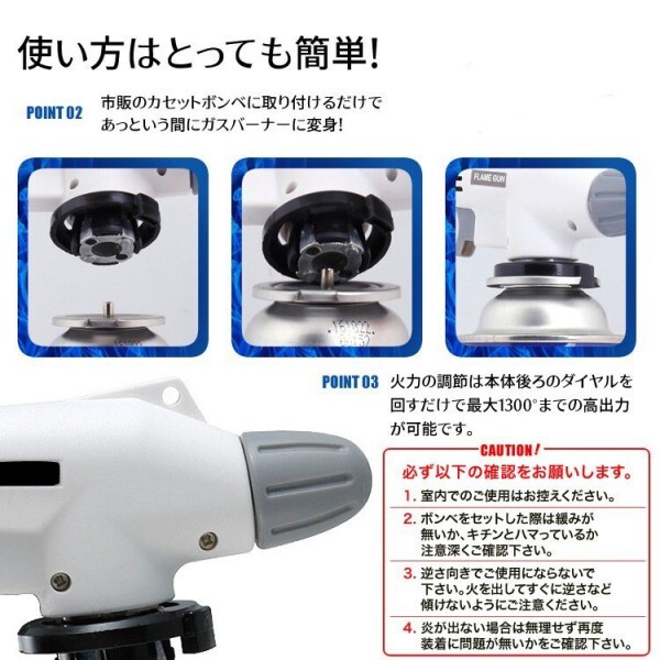 ボンベをセットしてカチッとすると点火します。女性にも安心にご使用いただけます。