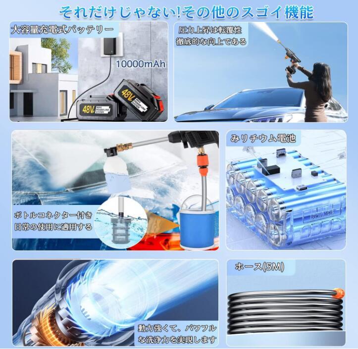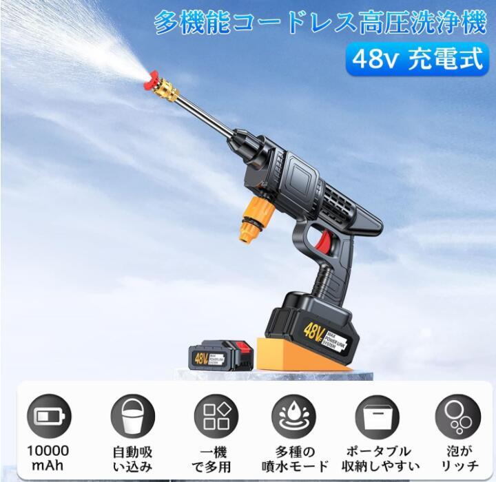 • 【可充電10000mAhの48V大容量バッテリー】弊社のコードレス高圧洗浄機はの10000mAh、21Vリチウム充電電池パックを搭載しています。最大60分間の連続稼働。頻繁な充電の手間を省きます。タンク式高圧洗浄機のガンと本体が一体化したハンディウォッシャーです。大型純銅モーターを本体内部に搭載。によって生成される水圧は3MPa と高く。