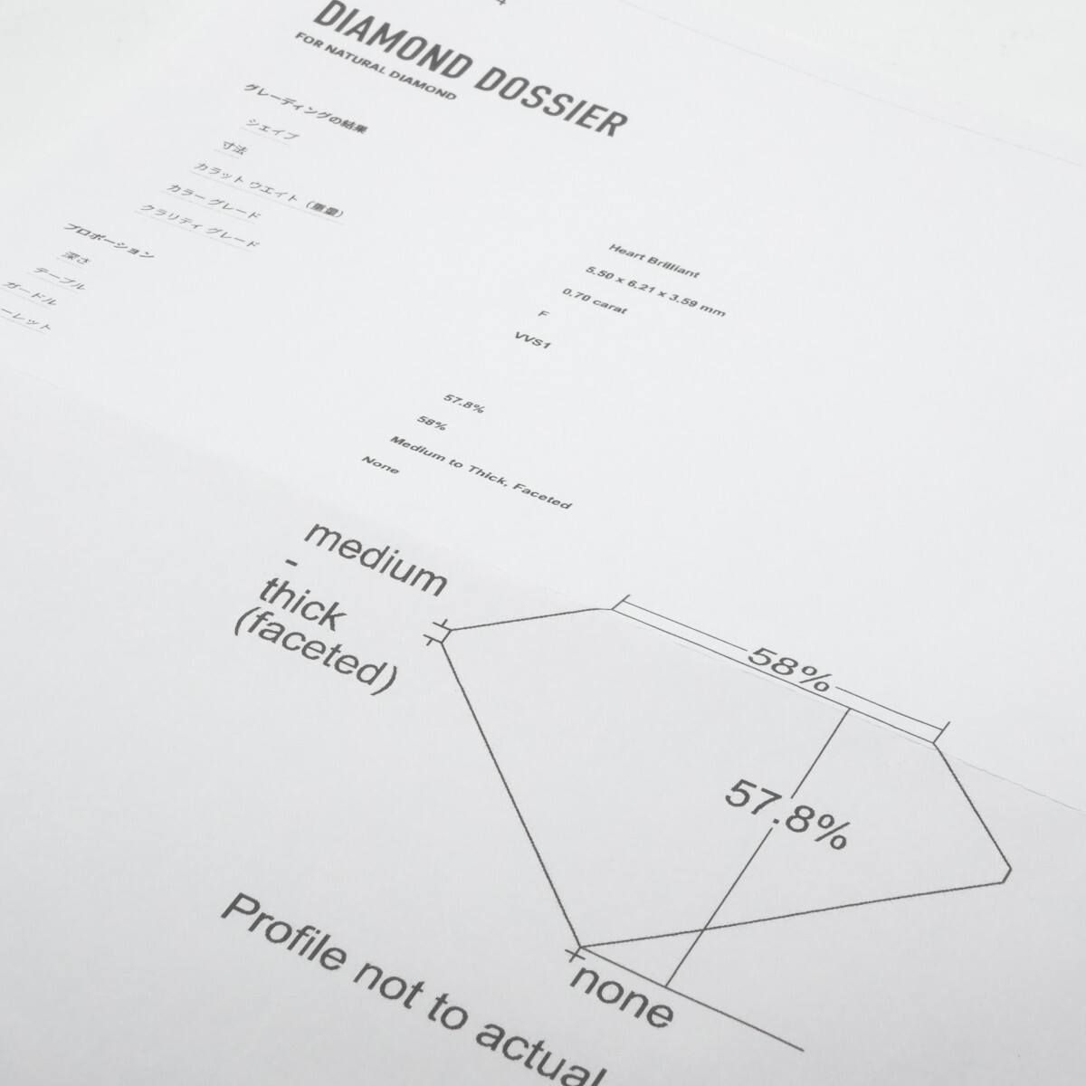 | 宝石 | ダイヤモンド カラット 0.70ct カラー F クラリティ VVS1 ポリッシュ EXCELLENT シンメトリー VERY GOOD 蛍光性 NONE |