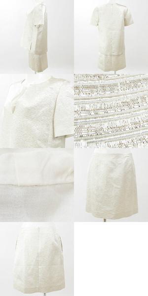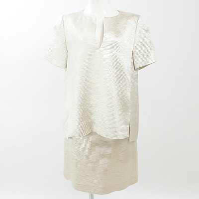 | リッチな光沢感が魅力的なセットアップを入荷しました♪ プルオーバータイプのトップスとタイトミニスカートの組み合わせ。 トップスはスキーパーデザインでお顔まわりがシャープにすっきり見えます。 単品使いもOKなので、コーデの幅が広がりますね♪ 上下とも、バックファスナー仕様。 トップスのアームホールに気にならない程度の薄汚れが見られます。 トップス 着丈約60~62㎝ 袖丈約24㎝ 肩幅約36㎝ バスト約96㎝ スカート ウエスト約74cm ヒップ約98cm スカート丈約45cm 【サイズ】:(38) 【素 材】:(アセテート53%・綿23%・ポリエステル18%・ナイロン6%(裏生地 キュプラ100% 別布部分 ポリエステル100%)) 【 色 】:(白) 【程 度】:(A) 8438-20140616-023 301 037 | ||||
