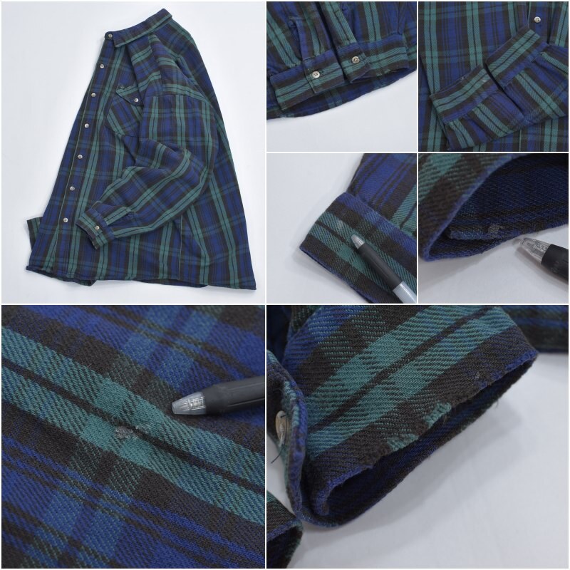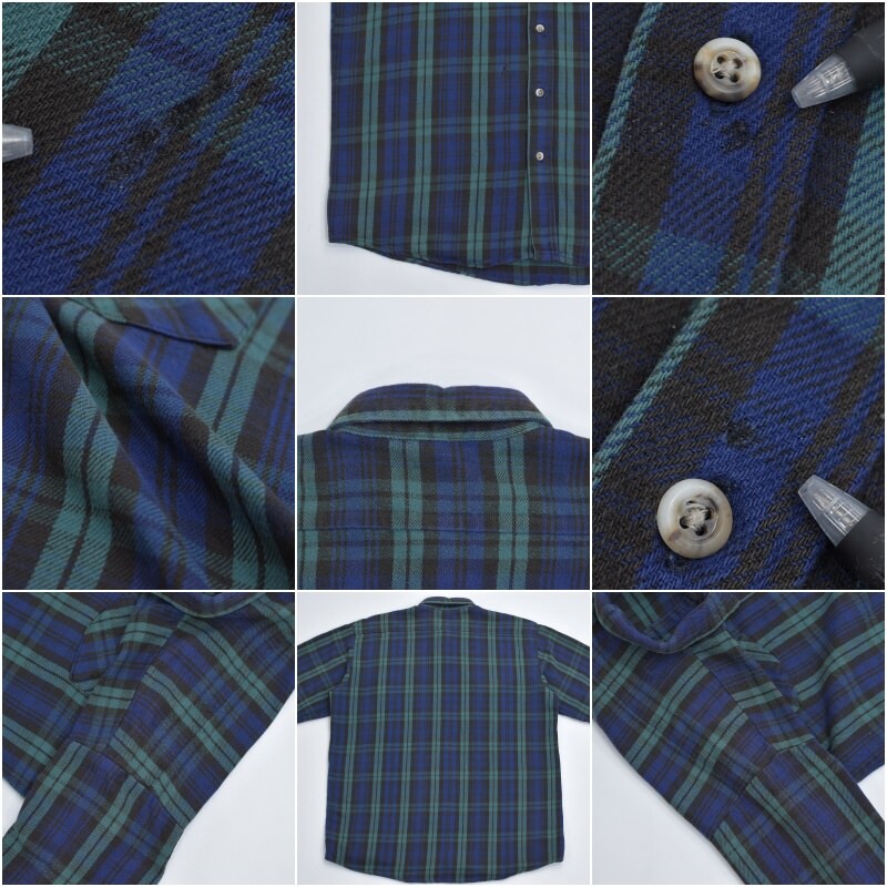 ・使用感や、色褪せ、画像の様に第5~6ボタンの腹部付近の生地のダメージや、左手首付近の接着剤の跡や、右カフスのペイントの様な汚れ、左カフス口の擦れキズなどありますが、その他目立つ汚れ、ダメージは見当たらず、日常的に古着を着用されている方であれば、問題無く着用して頂けると思います