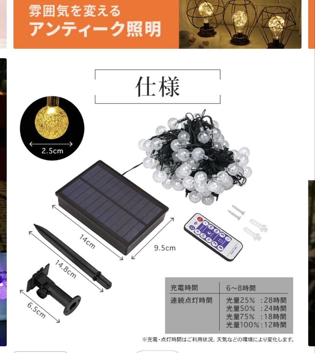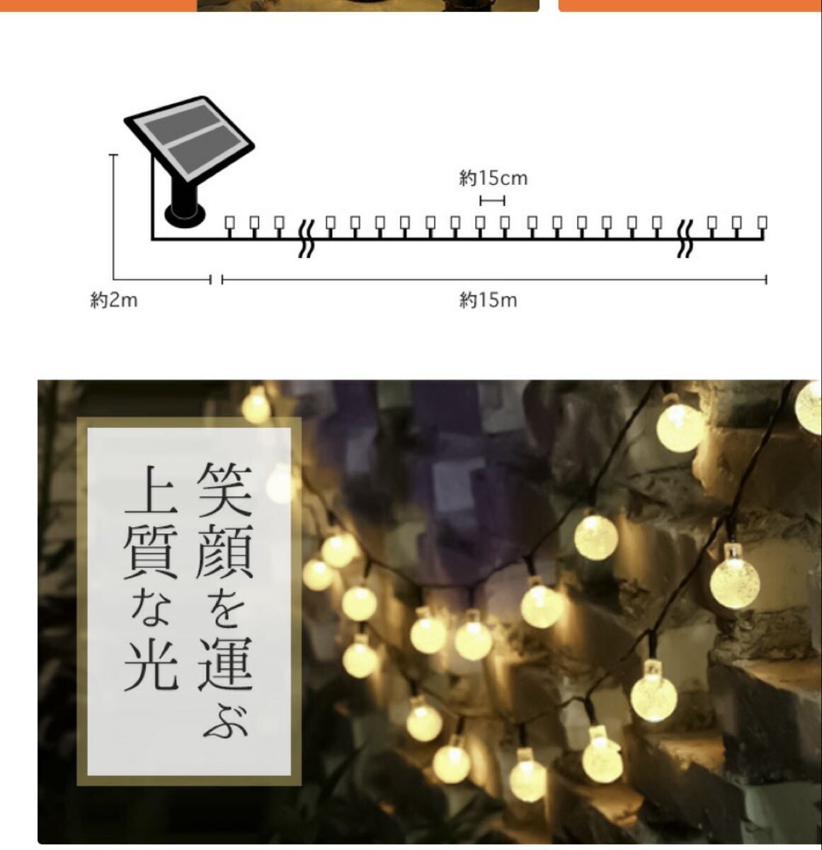 全長(約)17m(ソーラーパネルから電球まで2m + 電飾ケーブル15m)
