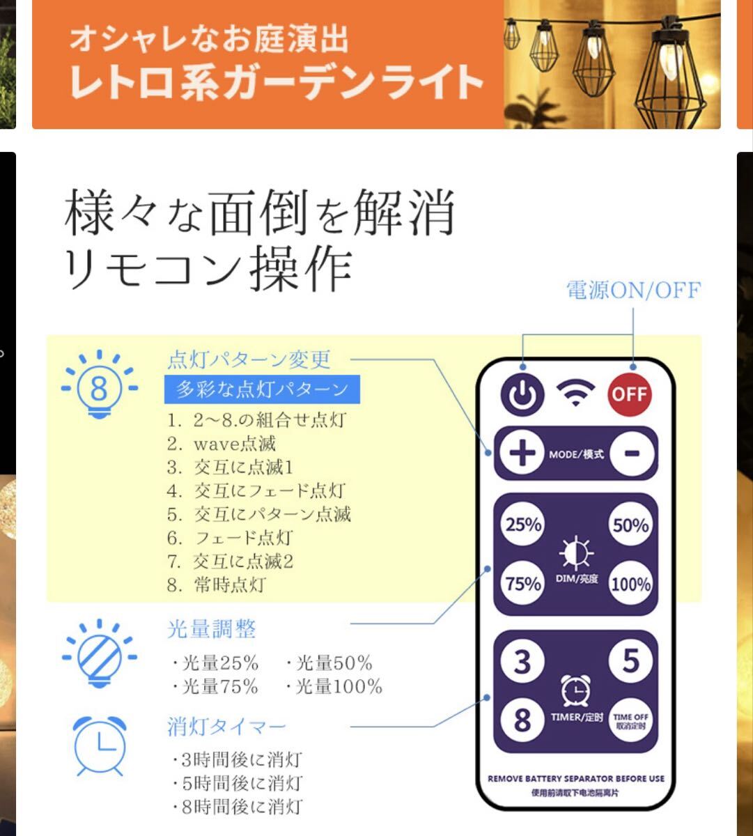電源ON/OFF、点灯パターンの変更、光量調整、消灯タイマー設定を離れた場所(最大5m)から楽々操作。