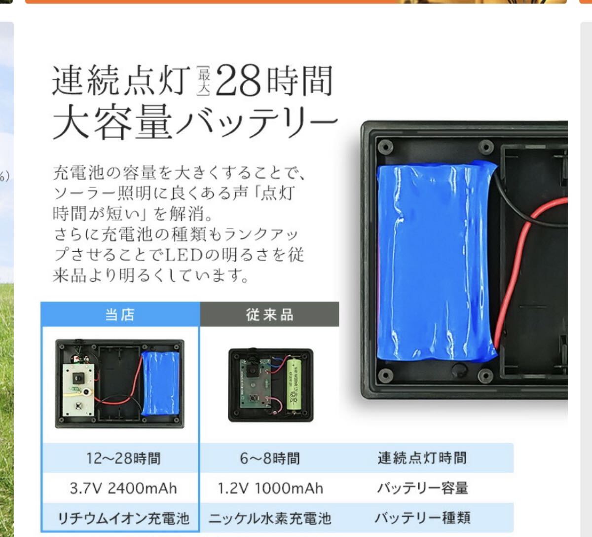 充電池の容量を大きく(2400mAh)することで、ソーラー照明に良くある声「点灯時間が短い」を解消。さらに充電池の種類もランクアップ(18650 リチウムイオン充電池)させることでLEDの明るさを従来品より明るくしています。