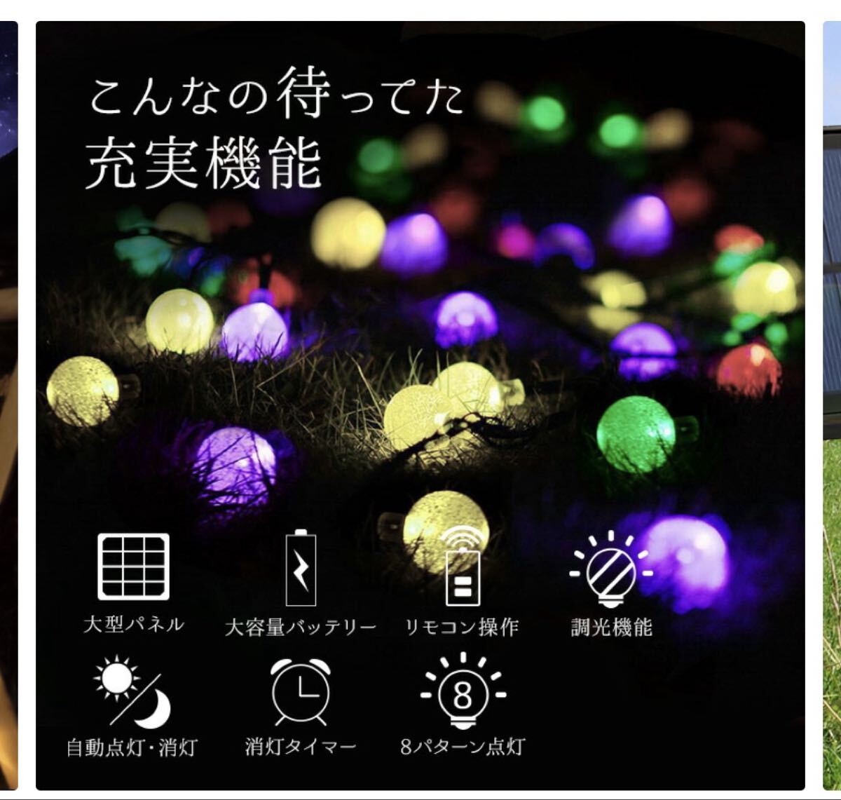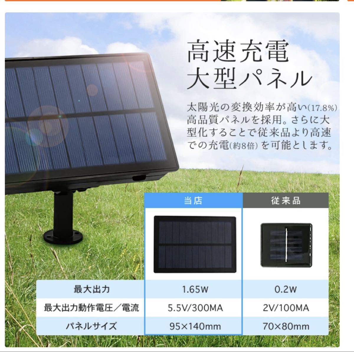 人気のLEDソーラーイルミネーション。太陽光の変換効率が高い(17.8%)高品質パネルを採用。さらに大型化することで従来品より高速での充電(約8倍)を可能としています。