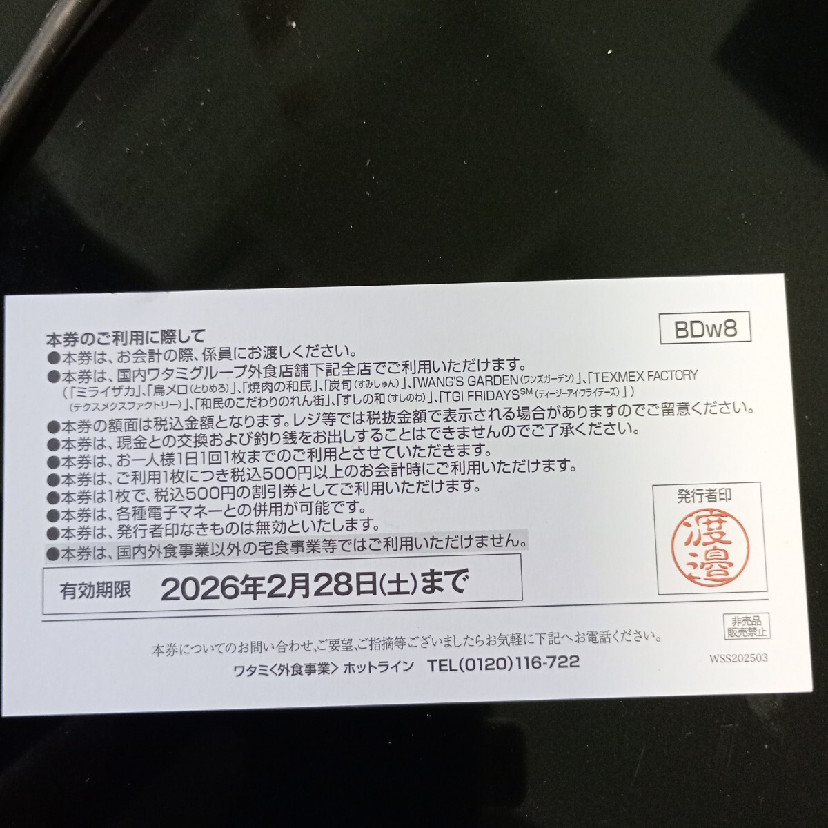 ワタミグループ共通クーポン券 500*5=2500円分 期限2026/2/28 使い方のわかる方限定( ミライザカ 鳥メロ すしの和 焼肉の和民 など)