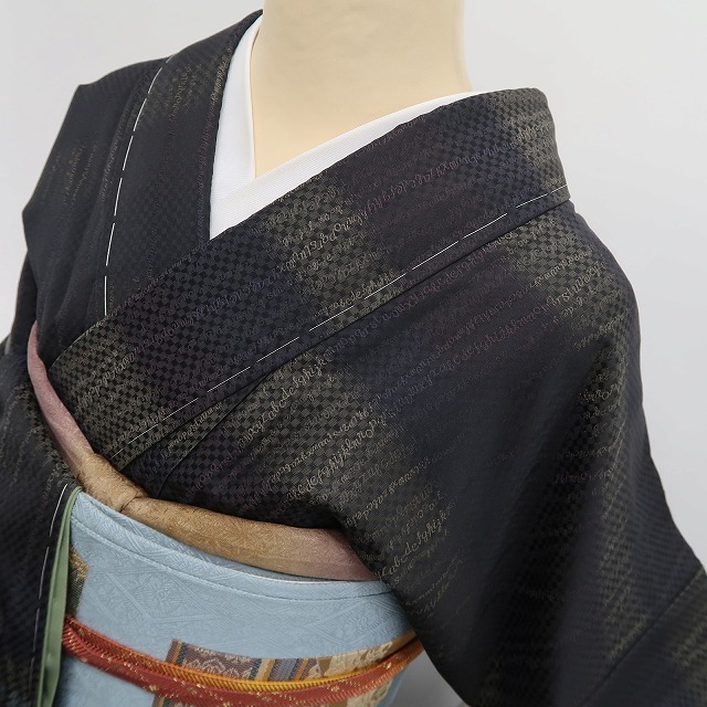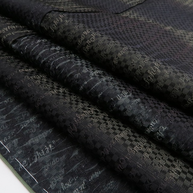 こちらのお着物は、一見すると黒地に抽象的な模様が広がるシックな印象ながら、その中には細かなアルファベット柄が潜んでいます。近くで見て初めて気づくさりげない遊び心が大人の装いに洒落た表情を添え、見る人を楽しませてくれる一枚です。