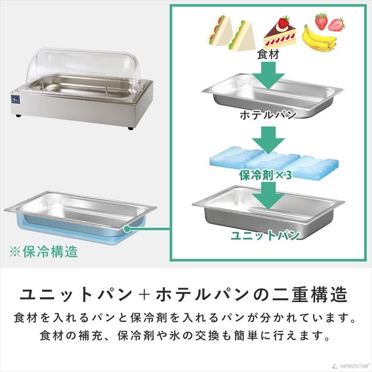 注意事項 | ●予め冷えた食材を一時的に保冷する事を目的としており、 食材を冷やす効果はございません。 ●保冷剤はご使用前に8~12時間冷凍して下さい。 ●直射日光の当たる場所に設置しないでください。 ●屋外に設置しないでください。 ●周辺に熱を発する機材を置かないでください。 ●高温、多湿、季節や設置場所の環境によっては多分に結露します。 ●機械周りに多量の水がこぼれる場合がありますので、 こまめに拭いていただくか、タオル等を敷いてご使用ください。 |