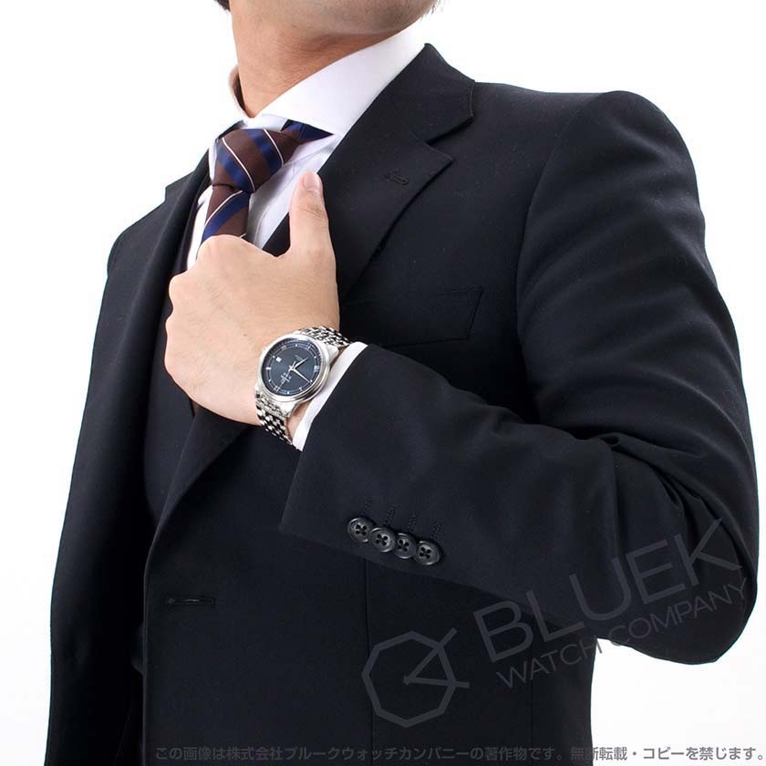 艶ありのシルバーステンレスケース・艶ありのシルバーステンレスベゼル・ブルー文字盤・シルバーの指針・ローマンとドットインデックス・12時位置にブランドロゴ・3時位置に日付表示・艶ありシルバーの7連ブレス・プッシュ式の片開きバックル・バックル部分、裏蓋にブランドロゴ・裏蓋にシリアルナンバー |