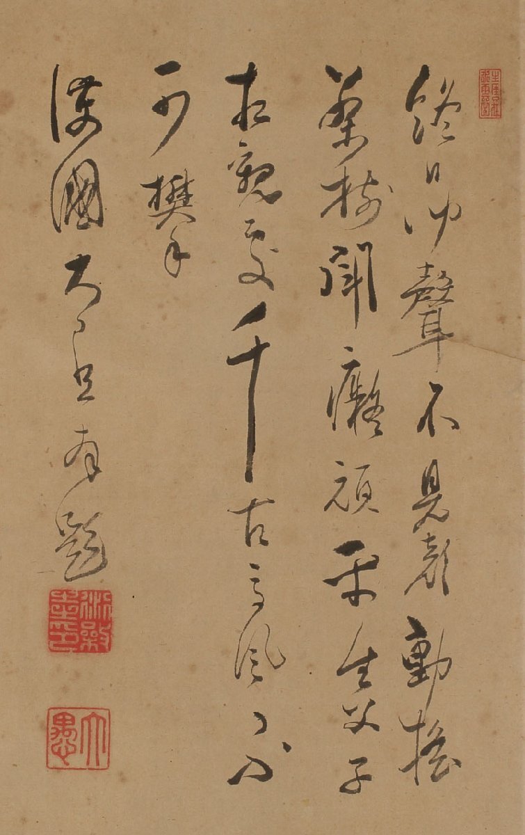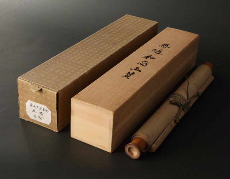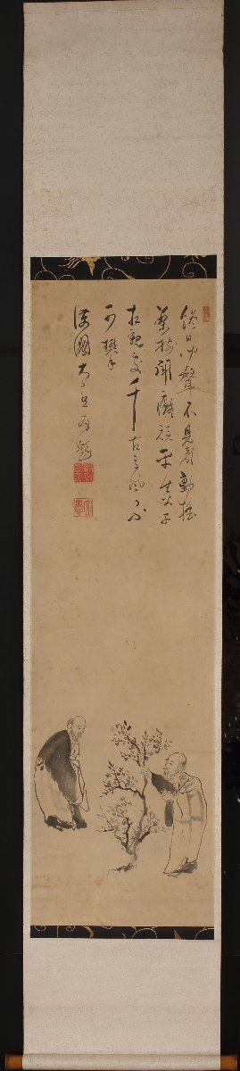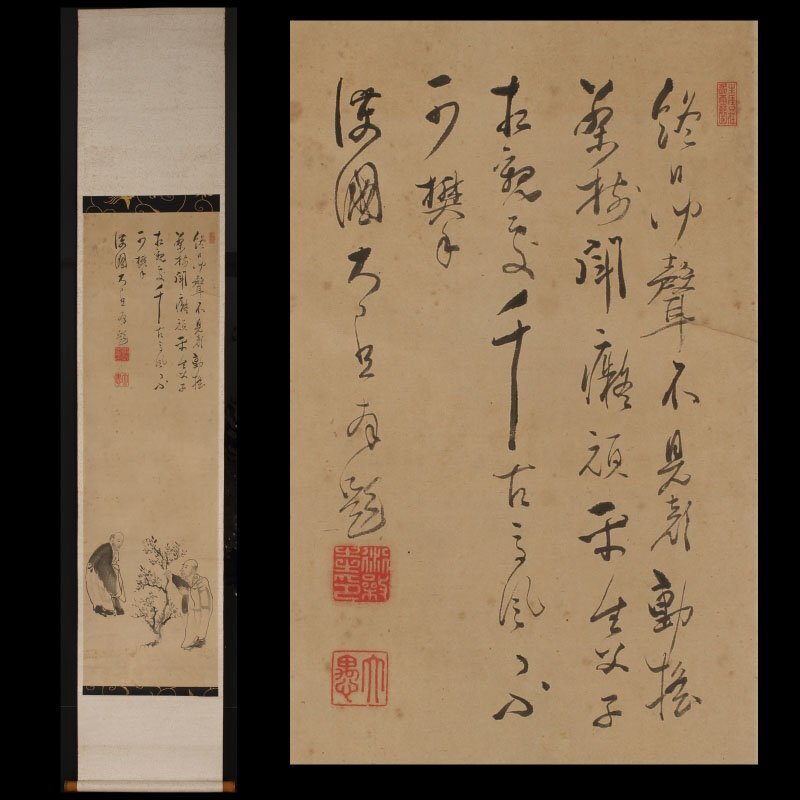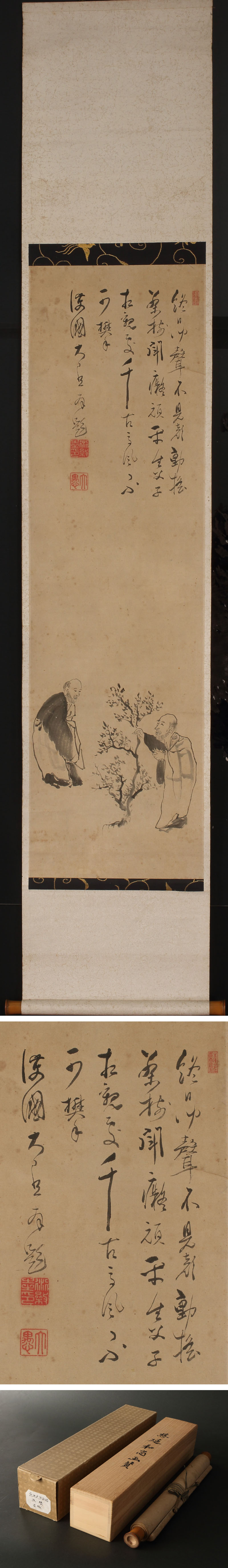 大愚衍操の自画賛です。 「イ山摘茶」は百丈懐海の法嗣・イ山霊祐(イはさんずいに為)とその弟子仰山慧寂の問答を基にした公案で、『伝灯録』では茶園での作務中の問答とされたことから茶にゆかりの公案として好んで描かれました。賛も公案にちなむものであり、師に「お前の声が聞こえるが姿が見えぬ」と問いかけられた仰山が茶の木を揺すぶったことで不立文字の本質に迫り、師に印可を与えられたエピソードを端的に吟じたものです。 大愚衍操は周防日積(現・山口県柳井市)の豪農に生まれ、飢饉の最中圧政に苦しむ農民の姿を見て出家、「孝」の字を一日一万回書く苦学の末黄檗書道に長じ、藩主重就に迎えられ萩東光寺の15世に昇りました。以後治親・斉房・斉熙の代に至るまで住しましたが、華美を好む斉熙に諫言が容れられず、「布金祇園」の四字の扁額を遺し、江戸上野で一雲水として暮らすことを選んだといわれます。 大愚の生涯には一農民の子に生を享けながら「禅」を通じ武家社会を変える気概が感ぜられます、唐様の書は然ることながら、飄々とした画技もまたしみじみと趣深い逸品です。 ◆大愚衍操 江戸中・後期の禅僧。黄檗宗。周防日積(現・山口県柳井市)の人。岩国大円寺で出家。徳山自得寺・河内法雲寺に住す。毛利重就の帰依を受け、東光寺15世。同寺中興ののち江戸を出て上野安福寺の開山となるが程なく病を得て帰郷。文政7(1824)年没、85歳。 〔本文〕 終日聞声不見顔動揺 茶樹聞癡頑平生父子 相親処千古高風不 可攀 護国大愚拝題(印) 〔本文〕 終日声を聞けど顔を見ず、動揺す 茶樹 癡頑を聞く、平生 父子 相親しむ処、千古の高風 攀づべからず 付属:合わせ箱が付属します。 寸法:高さ161cm、幅30cm(最大幅。若干の誤差はご了承下さい) 状態:経年のヤケ・イタミがございます。 |