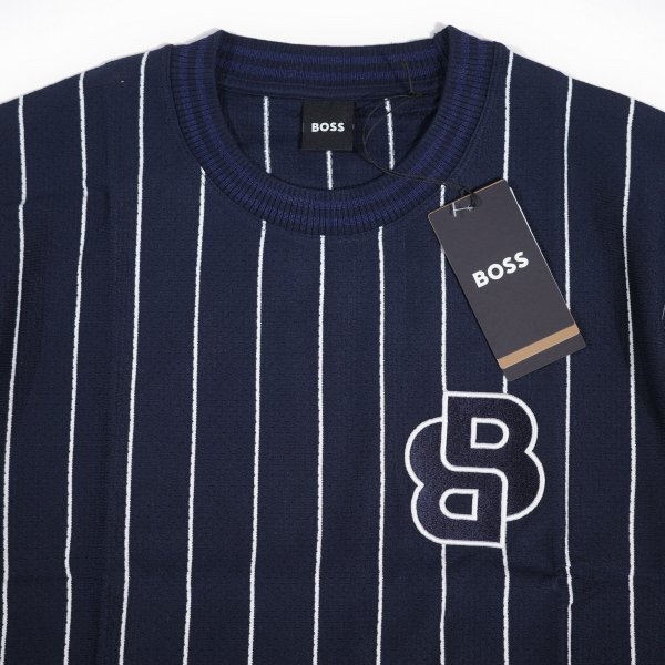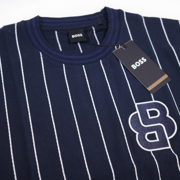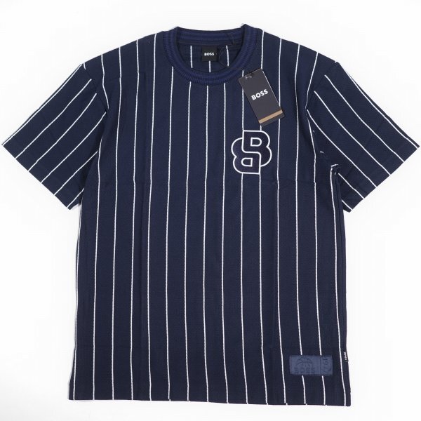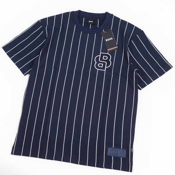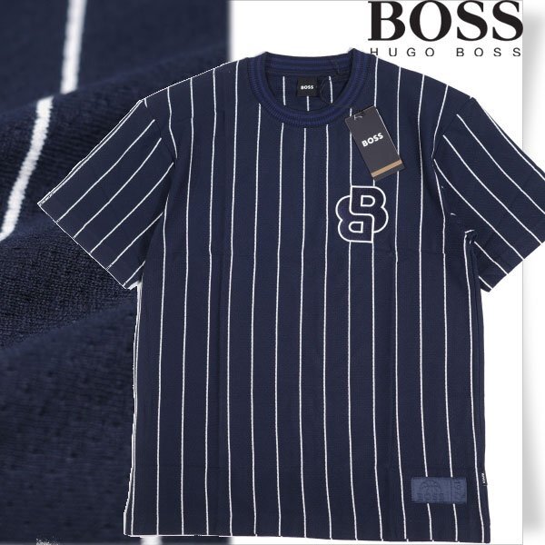 定価3.4万 BOSS ボス メンズ 最高級ライン ストライプ ロゴ コットン綿 半袖 クルーネックTシャツ 紺 ヒューゴボス |