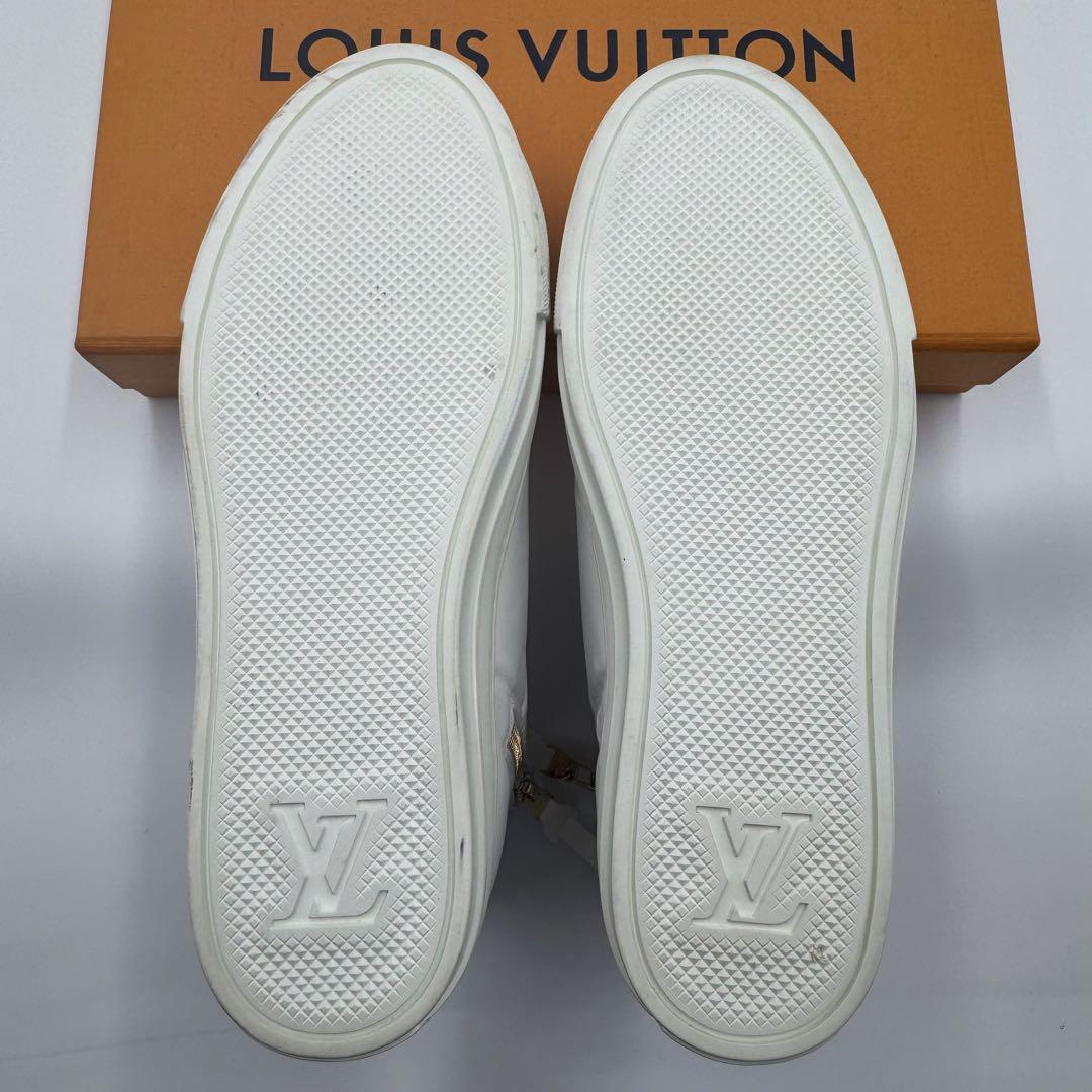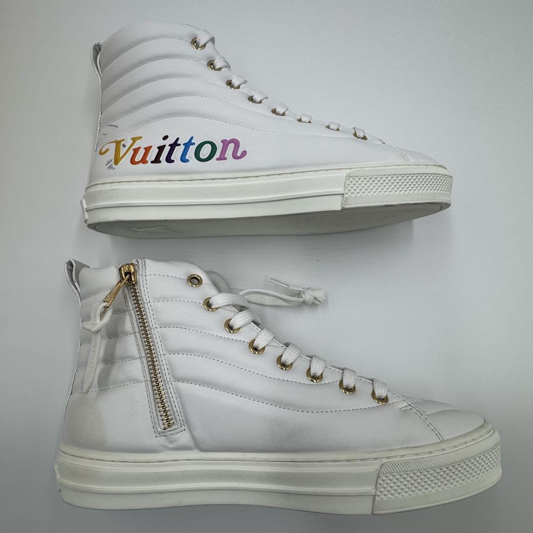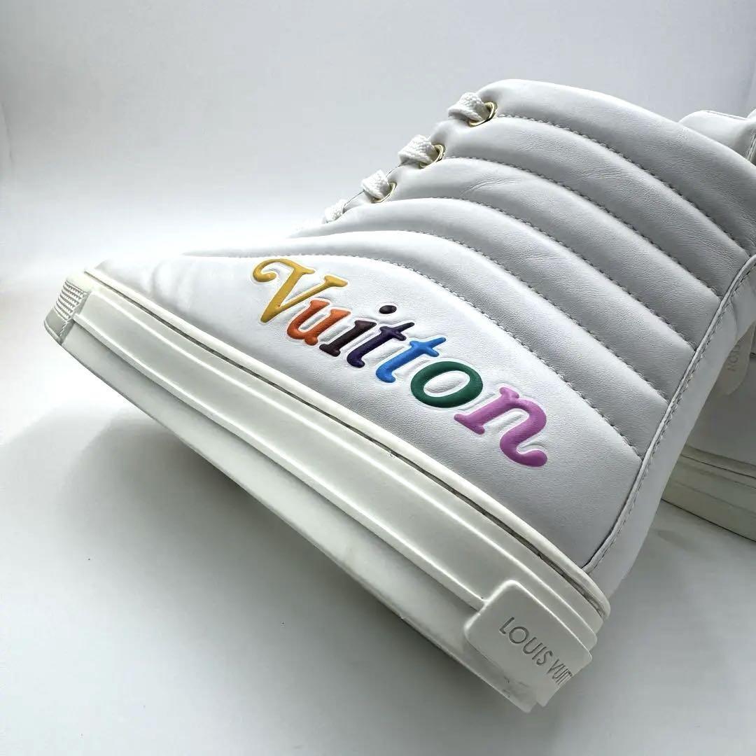 ホワイトレザーのハイカットスニーカー、ゴールド金具付き。