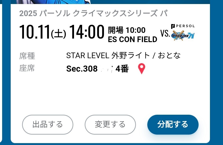 10月11日パリーグCS 第1戦 エスコンフィールド北海道 日本ハムファイターズ × オリックスバファローズ戦。 STARLEVEL 外野ライト2枚です。友人とチケットがダブりましたので、出品します。期日があるものですので、入札後、落札後のキャンセルは、致しませんので、確認の上ご入札ください。期日が迫っていますので、落札後は、1時間以内にシステムの方でご連絡ください。落札後は、メールでの送信をいたしますので、取引ナビでご連絡ください。 メールで受取確認ができましたら、システムの方で、受取連絡をお願いいたします。チケットは、1枚3000円で2枚なので6000円の席になります。定価以下の出品になります。