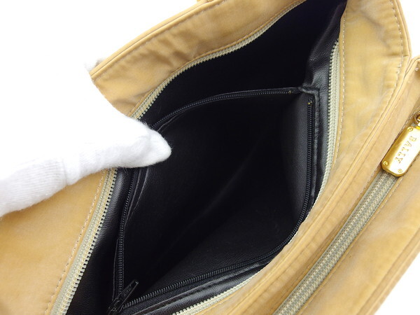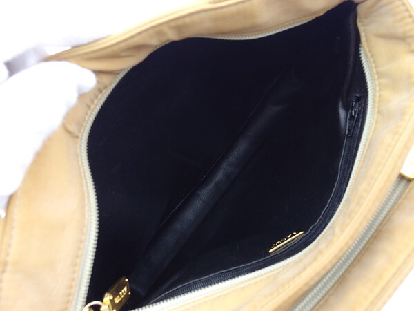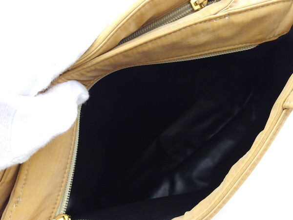 | コンディション | 全体の状態詳細:使用感はございますが、まだまだご使用いただけます。外側:ファブリック(角スレ、黒ずみ、表面の右下に1箇所ボールペン跡、若干の変色)、ショルダーストラップ(変色、チェーン部分に傷&くすみ)、ロゴプレート(傷、くすみ、メッキハゲ)、ファスナー金具(傷、くすみ)あり。内側:内張(傷)、ファスナーポケット(内張に傷)、ロゴプレート(傷)あり。その他、中古品のため 目立たない 傷 汚れ などの一般的使用感があります。 |