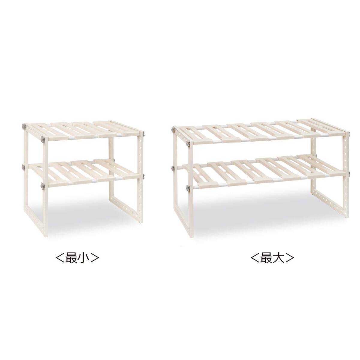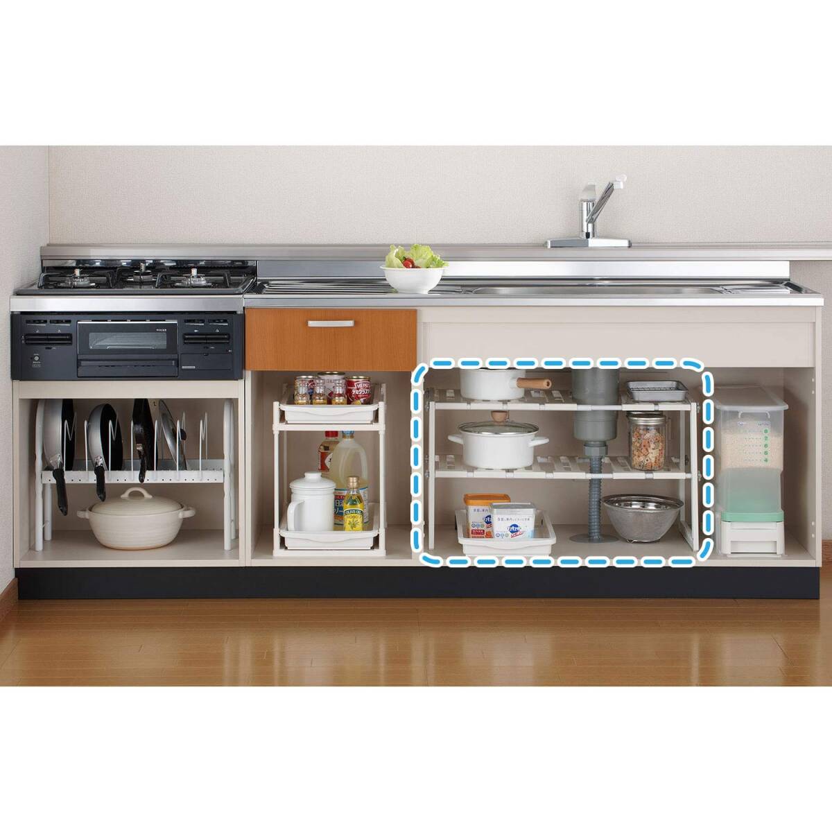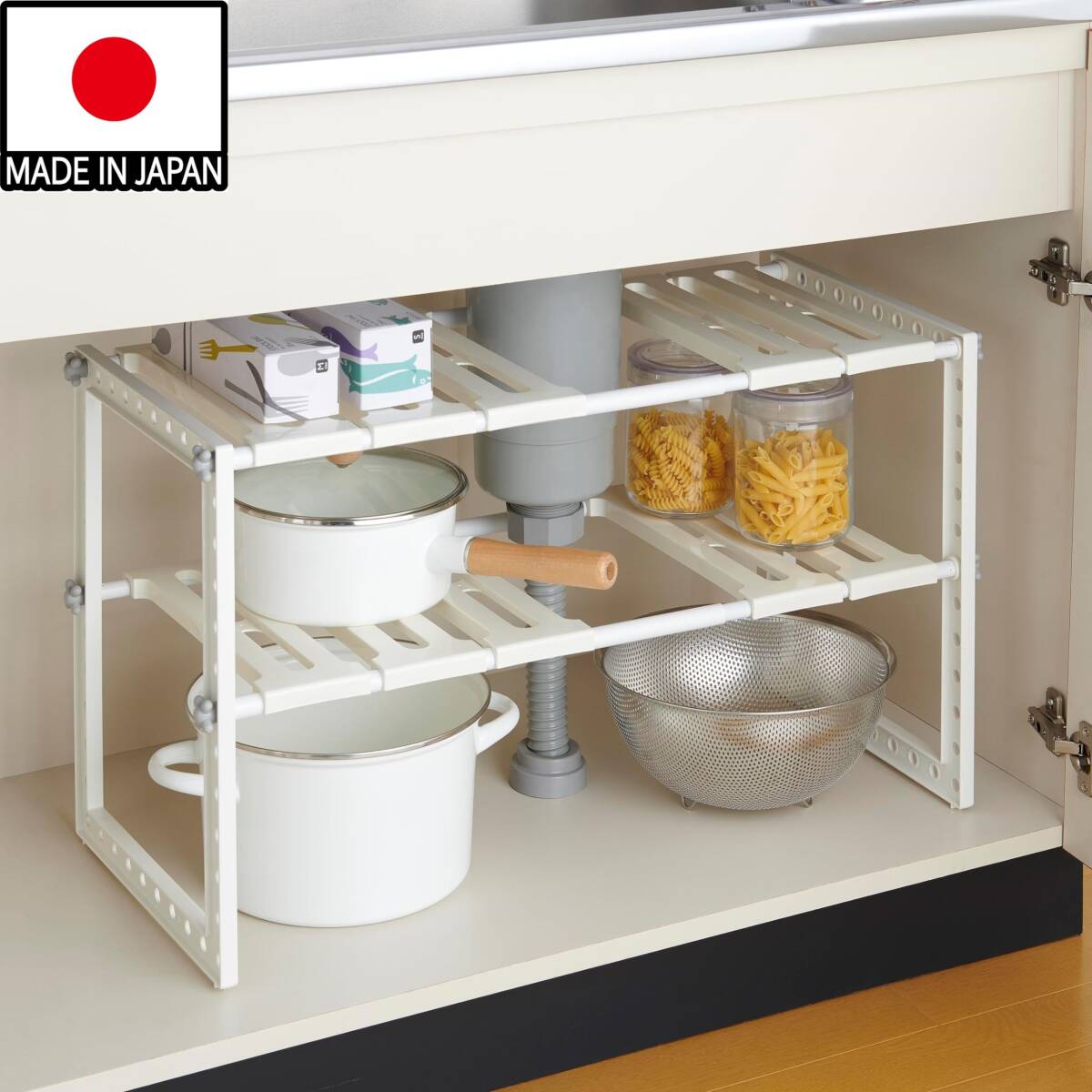 シンク下のサイズに合わせて幅50~75cmの間で伸縮することができ、棚の高さも3cm間隔でスペースに合わせて調節できます。