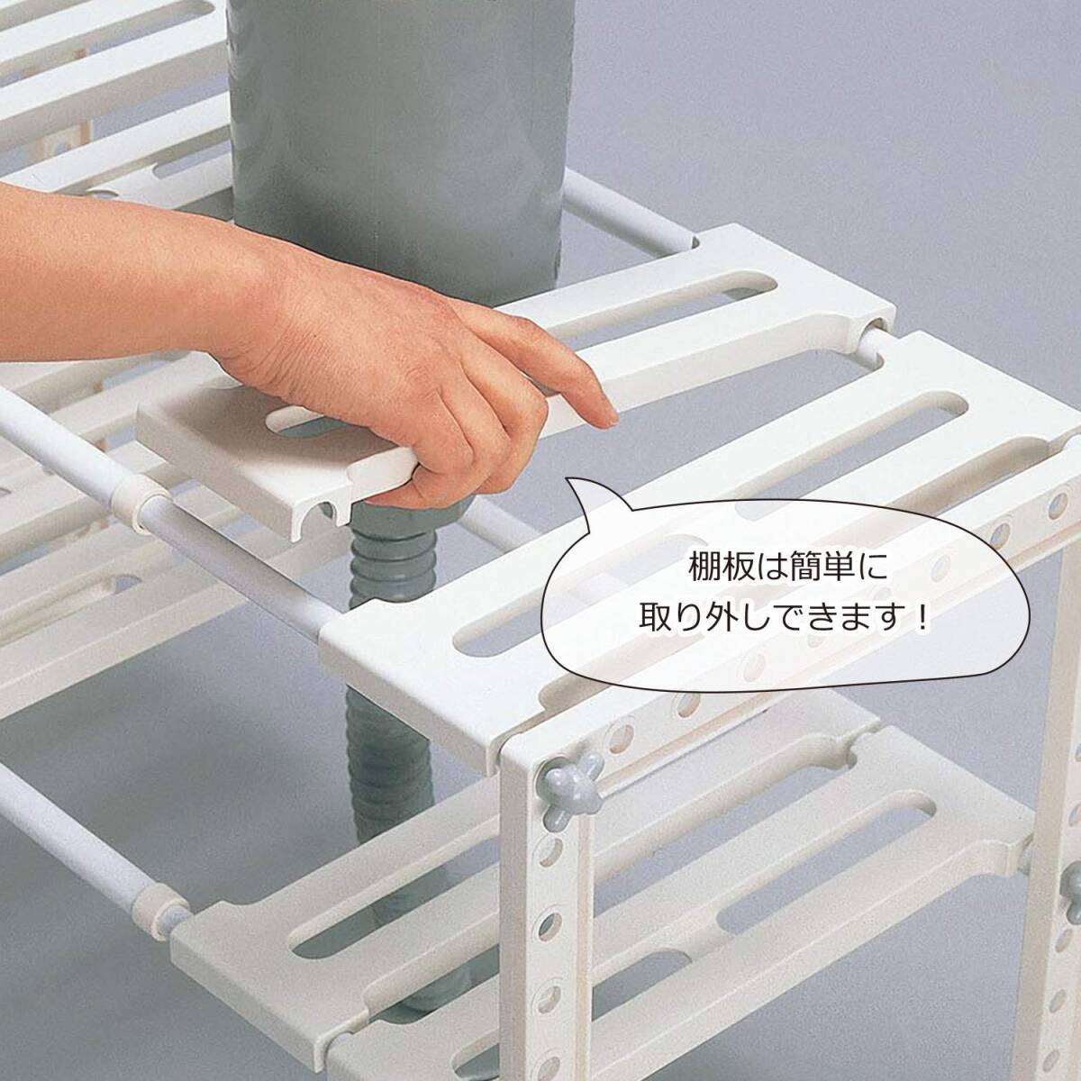 棚板が取り外しが可能になっているので、シンク下の排水トラップを避けて棚が作れます。