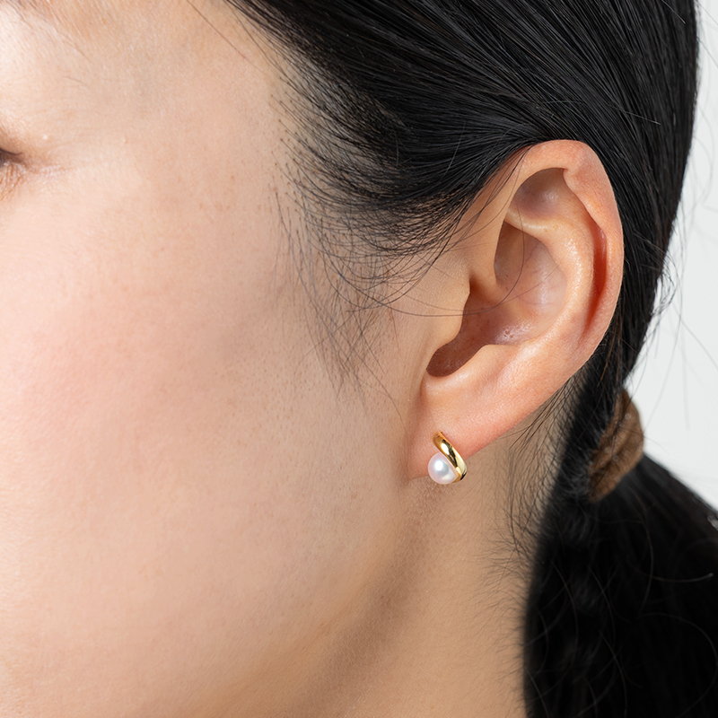 5.5mmのアコヤパールをあしらった、K18イエローゴールドのピアス。