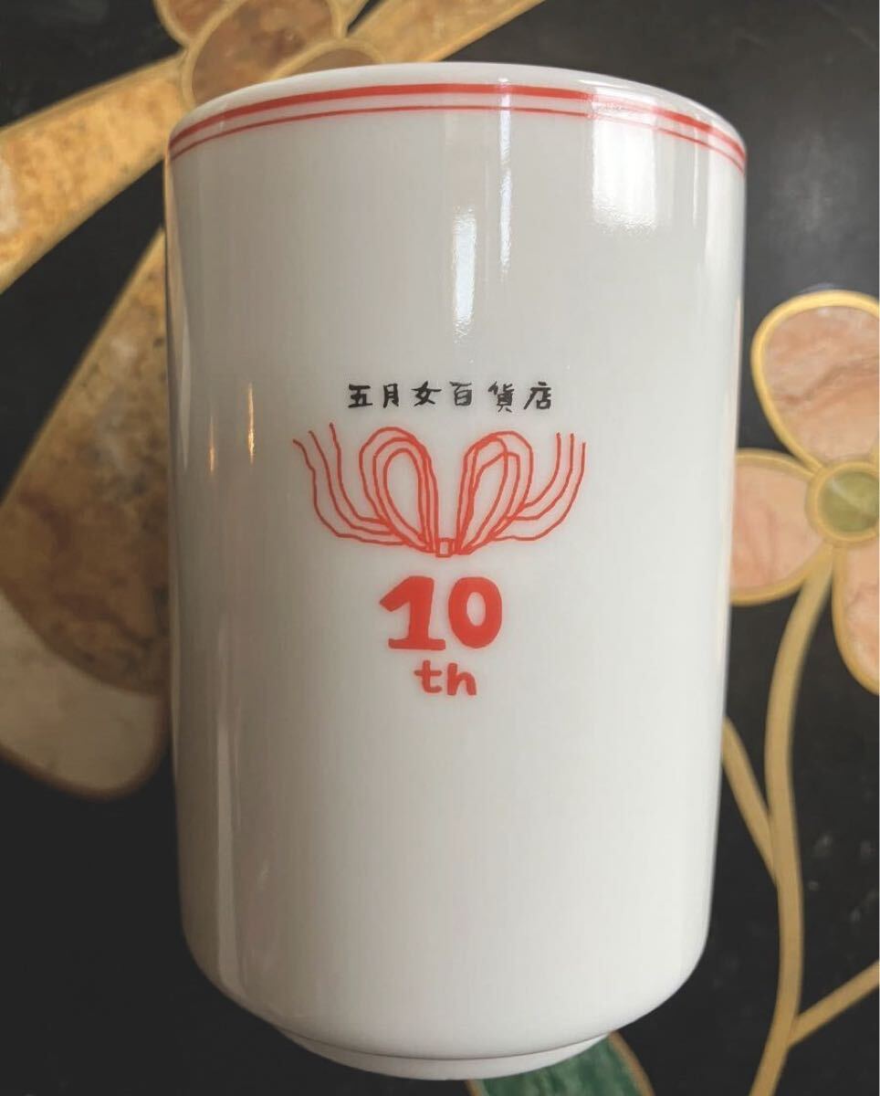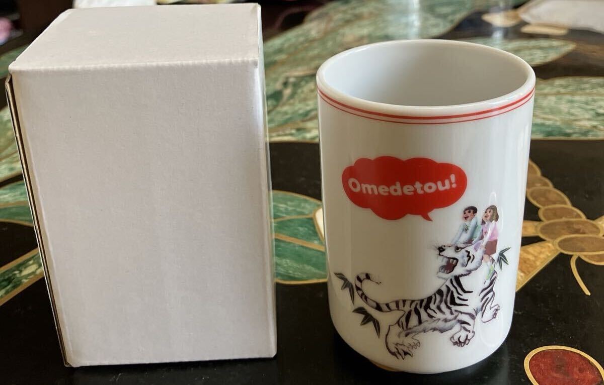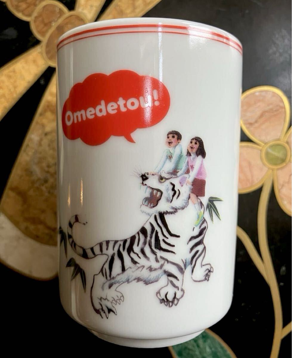 五月女ケイ子さんの五月女百貨店10周年記念のお湯呑みです。ホワイトタイガーが凛々しくカッコ良いです。お茶やコーヒー、もちろんお酒、めでたい気分上々です。