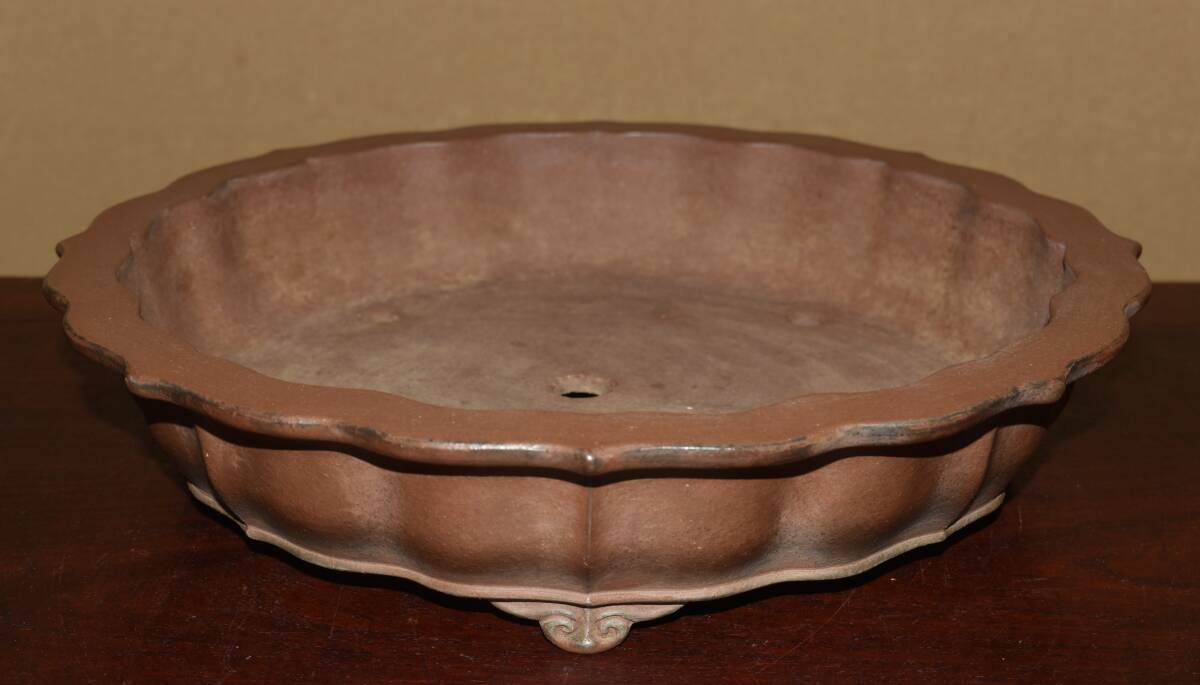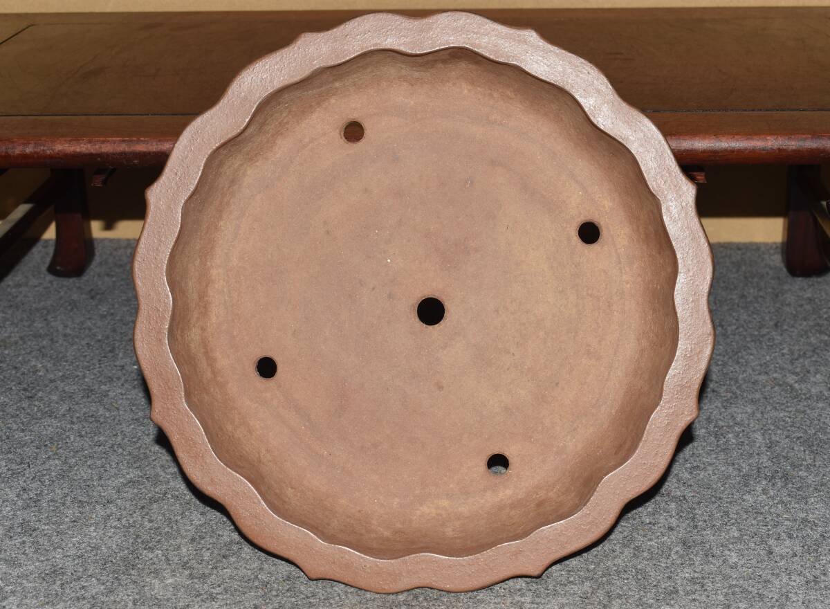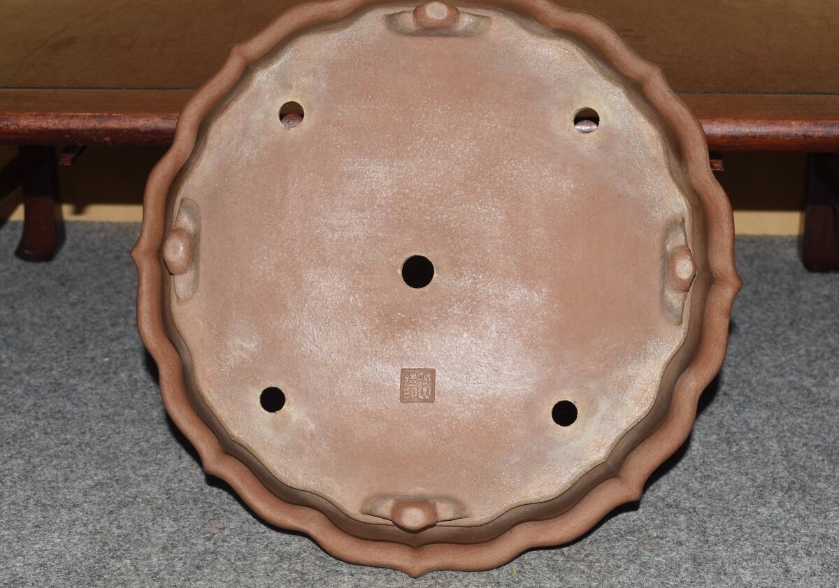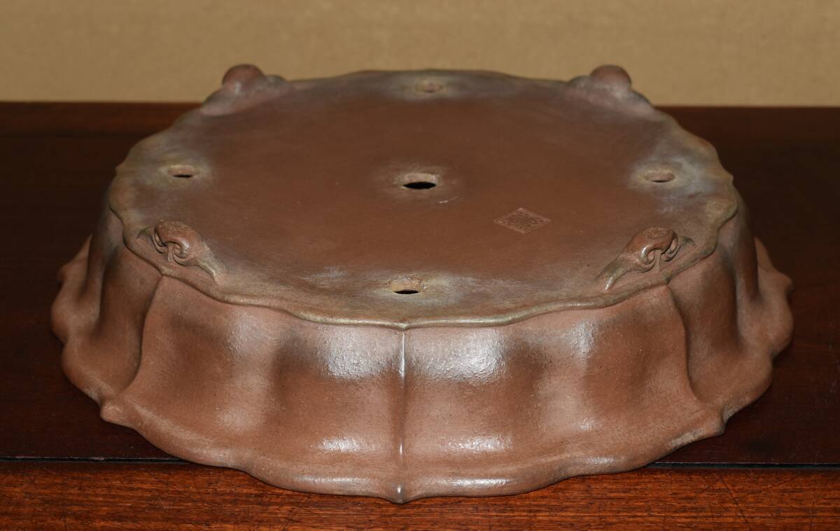 サイズ 32,0×7,0cm 人気和鉢作家<誠山・紫泥・手造り、釘彫落款★時代乗り満点★使い頃サイズ・繊細なフォルム>外縁雲脚輪花古鏡鉢のご紹介です・・希少大人気型・皐月、松柏に最適な逸品。使い頃サイズ、繊細なフォルム・・ 紫泥の泥味が良く、実用にも優れた素晴らしい品です・傷はありません。・・ 大変古い物ですので縁・足等にホツ・スジ・カケ等がある場合がございます。 状態を良くご確認の上、ご入札宜しくお願い致します。。画像を良くご確認の上、御入札宜しくお願い致します。完品をお求めの方は入札をお控えお願い致します。*注意事項* オークション終了後48時間以内に必ずご連絡をお願いします。ご連絡がない時は、ご購入意思がないと判断し、落札者さま都合のキャンセルとさせて頂きます。再三のご連絡を差し上げても、ご連絡がない場合は、時点繰り上げとさせて頂きます。マイナス評価の多い方や新規の方を削除する場合がありますので、ご了承下さい。また、入札価格が低価格の場合は取消終了とさせて頂く場合がございますので、ご了承願います。古い物等ございますので小さな傷等は、見落とす場合がございますので、写真を良くご覧になり納得の上ご入札して下さい。また、完品をお求めの方は入札をお控えお願い致します。キズ・破損等のご連絡は商品到着5日以内にご連絡ください。それ以降は対応致しかねますので到着後、商品を必ずご確認ください。輸送中の事故(鉢が割れる、枝が折れる等)につきましては商品到着時に確認し取引ナビまたは、お電話にてご連絡下さい。 基本土日の発送は行っておりません。ご了承ください。
