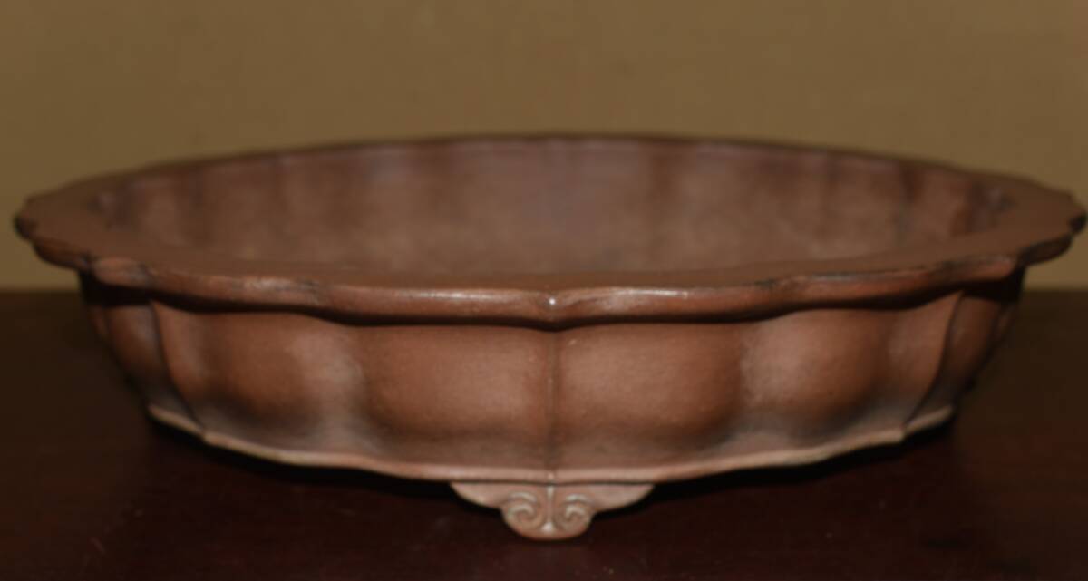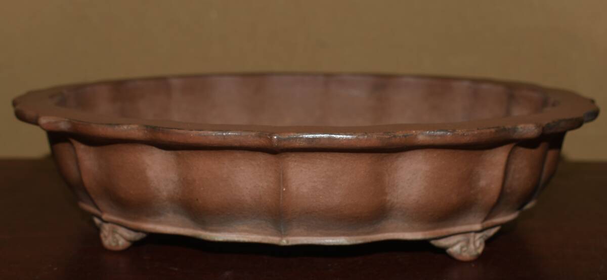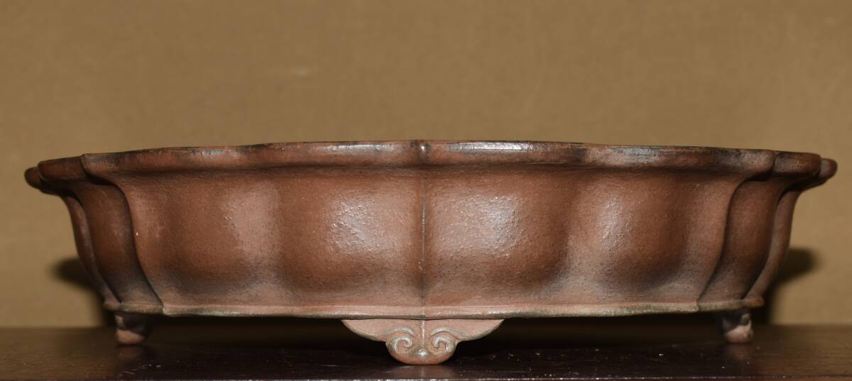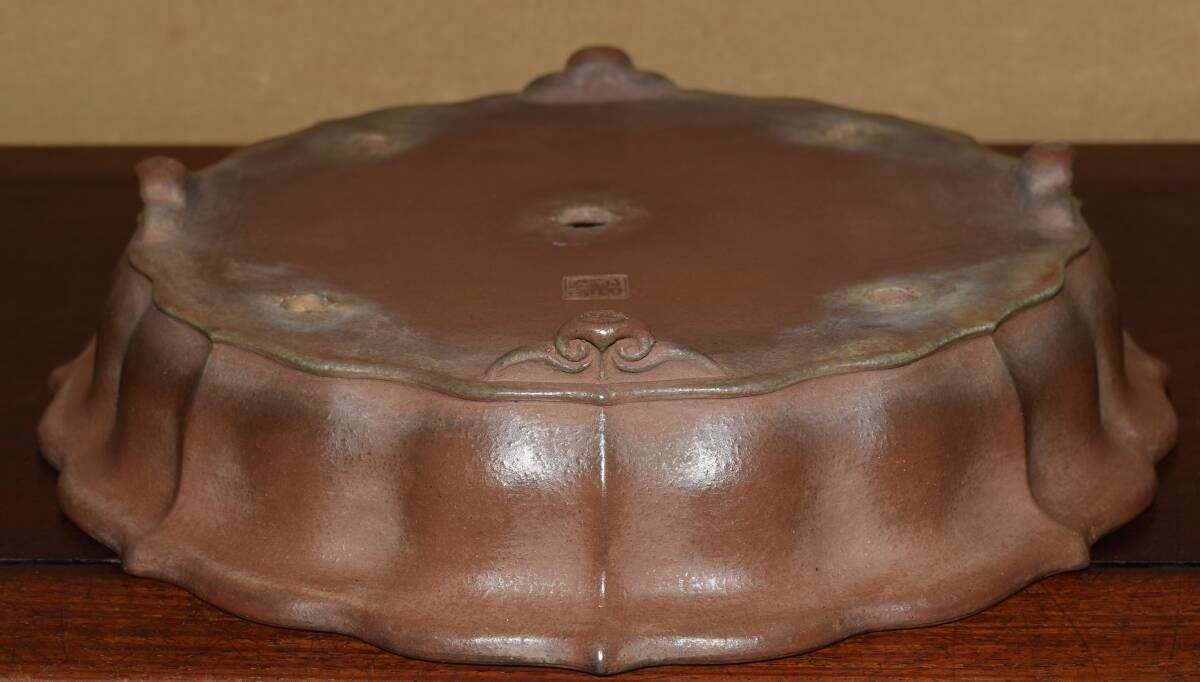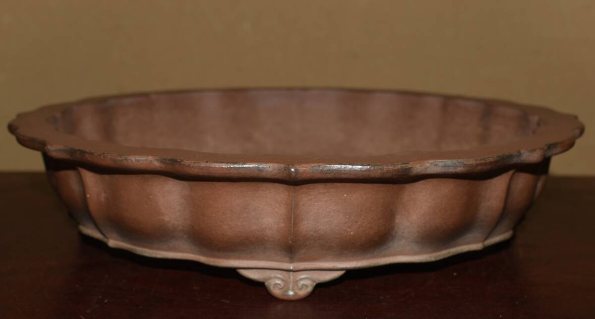 サイズ 32,0×7,0cm 人気和鉢作家<誠山・紫泥・手造り、釘彫落款★時代乗り満点★使い頃サイズ・繊細なフォルム>外縁雲脚輪花古鏡鉢のご紹介です・・希少大人気型・皐月、松柏に最適な逸品。使い頃サイズ、繊細なフォルム・・ 紫泥の泥味が良く、実用にも優れた素晴らしい品です・傷はありません。・・ 大変古い物ですので縁・足等にホツ・スジ・カケ等がある場合がございます。 状態を良くご確認の上、ご入札宜しくお願い致します。。画像を良くご確認の上、御入札宜しくお願い致します。完品をお求めの方は入札をお控えお願い致します。*注意事項* オークション終了後48時間以内に必ずご連絡をお願いします。ご連絡がない時は、ご購入意思がないと判断し、落札者さま都合のキャンセルとさせて頂きます。再三のご連絡を差し上げても、ご連絡がない場合は、時点繰り上げとさせて頂きます。マイナス評価の多い方や新規の方を削除する場合がありますので、ご了承下さい。また、入札価格が低価格の場合は取消終了とさせて頂く場合がございますので、ご了承願います。古い物等ございますので小さな傷等は、見落とす場合がございますので、写真を良くご覧になり納得の上ご入札して下さい。また、完品をお求めの方は入札をお控えお願い致します。キズ・破損等のご連絡は商品到着5日以内にご連絡ください。それ以降は対応致しかねますので到着後、商品を必ずご確認ください。輸送中の事故(鉢が割れる、枝が折れる等)につきましては商品到着時に確認し取引ナビまたは、お電話にてご連絡下さい。 基本土日の発送は行っておりません。ご了承ください。