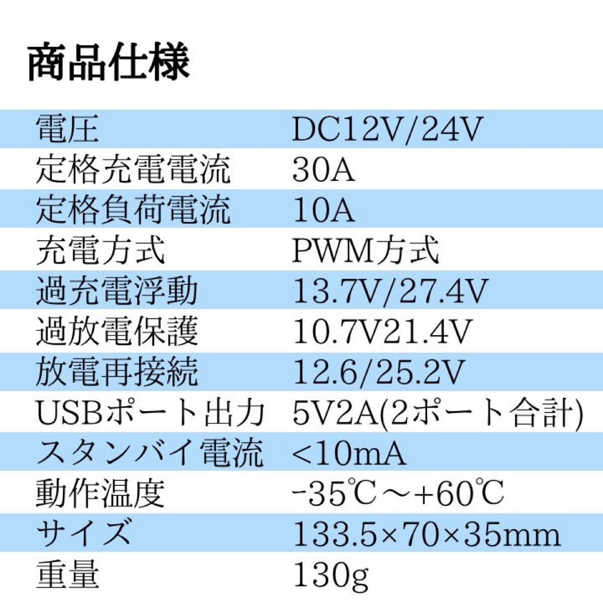 自動認識で12Vか24Vにバッテリーが切り替わります。また、30Aの電流制御機能も備わっています。