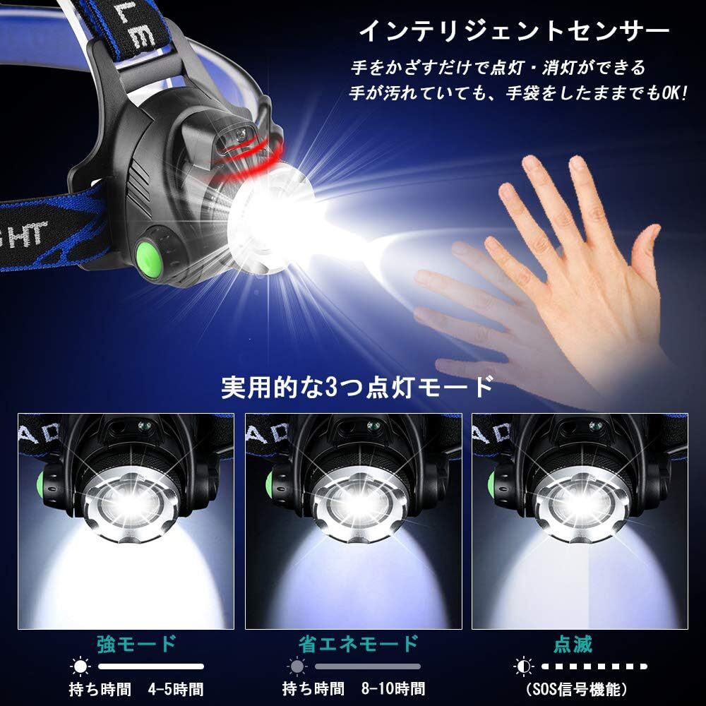 【人体センサー搭載】 ジェスチャセンサーを内蔵し、ヘッドライトを振ってオン/オフします。3秒間スイッチを押しますテールランプが青に変わるとモードがオンになっています. 手を振ると(10 cm以内)点灯/消灯でき、自由に作業できるようになります。 【3点灯モード】三つの点灯モード(強-弱-点滅)がありますので、スイッチを押すごとに適切なライトモードを選択できます。十分な明るさで細かな作業でも大活躍。 【調整可能】ヘッドライトは、約90°の角度調整可能、自分の需要によって、適切な照射角度を調整できます。ヘッドバンドの長さが調節できますので、頭にしっかりフィットし安心できます。ライトも取り外す可能で、持ち運び便利です。 【ジェスチャーセンシング機能搭載】センサーボタンを3秒長押しすると、センサーモードが開始になります。手をかざすだけでライトがON/OFFできる。両手が自由になって、手袋や汚れた手でもOK。 【軽量型】約370gの軽量ヘッドライト、長時間で頭に着けていても疲れません。両手が自由になるので用途は様々です。小さくて軽いから、持ち運びに便利です。 セット:ヘッドライト、USBケーブル、18650リチウムイオンバッテリ*2。