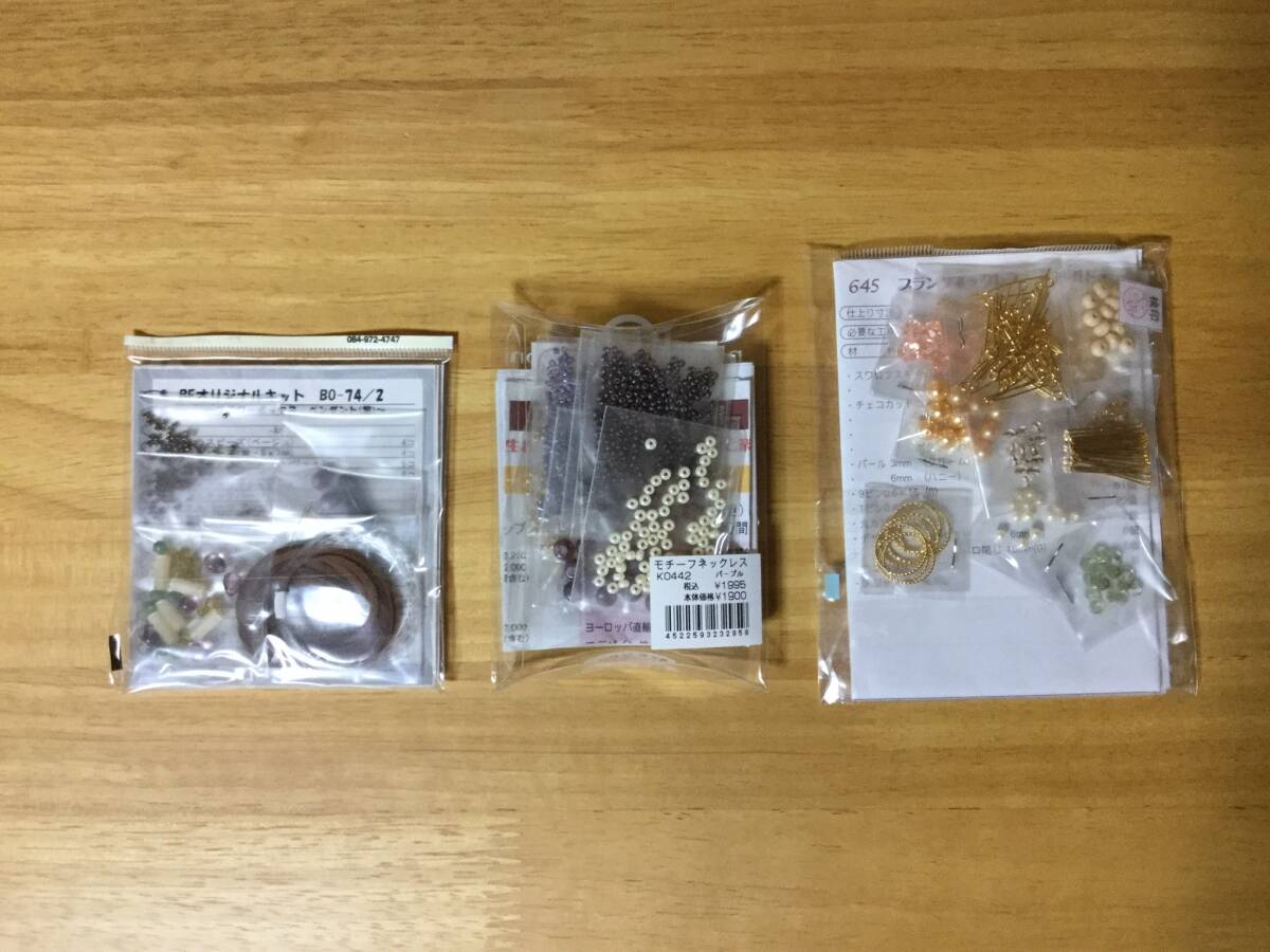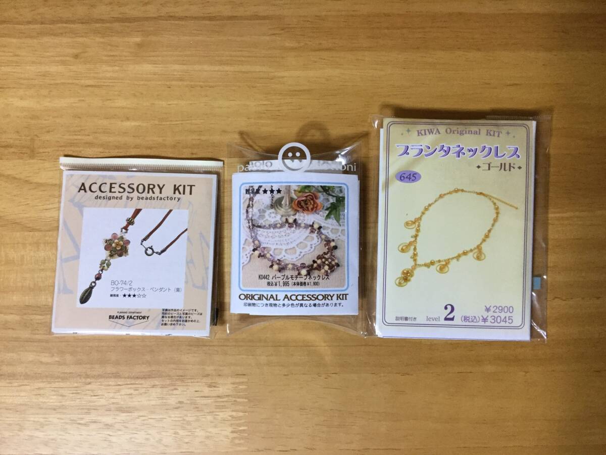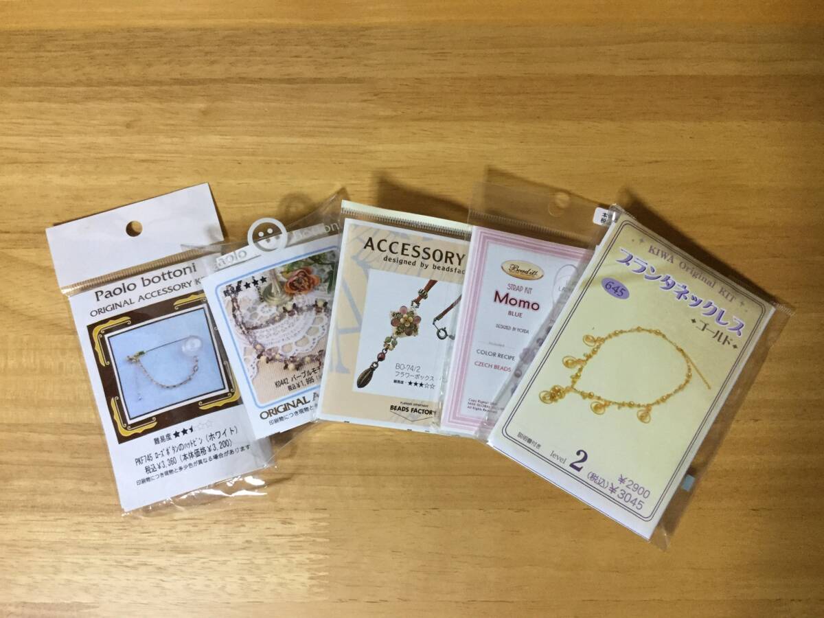 ビーズアクセサリーの作成キット5種をセットにして出品します。ネックレス3種とハットピン、ストラップ各1種です。いかがでしょうか。
