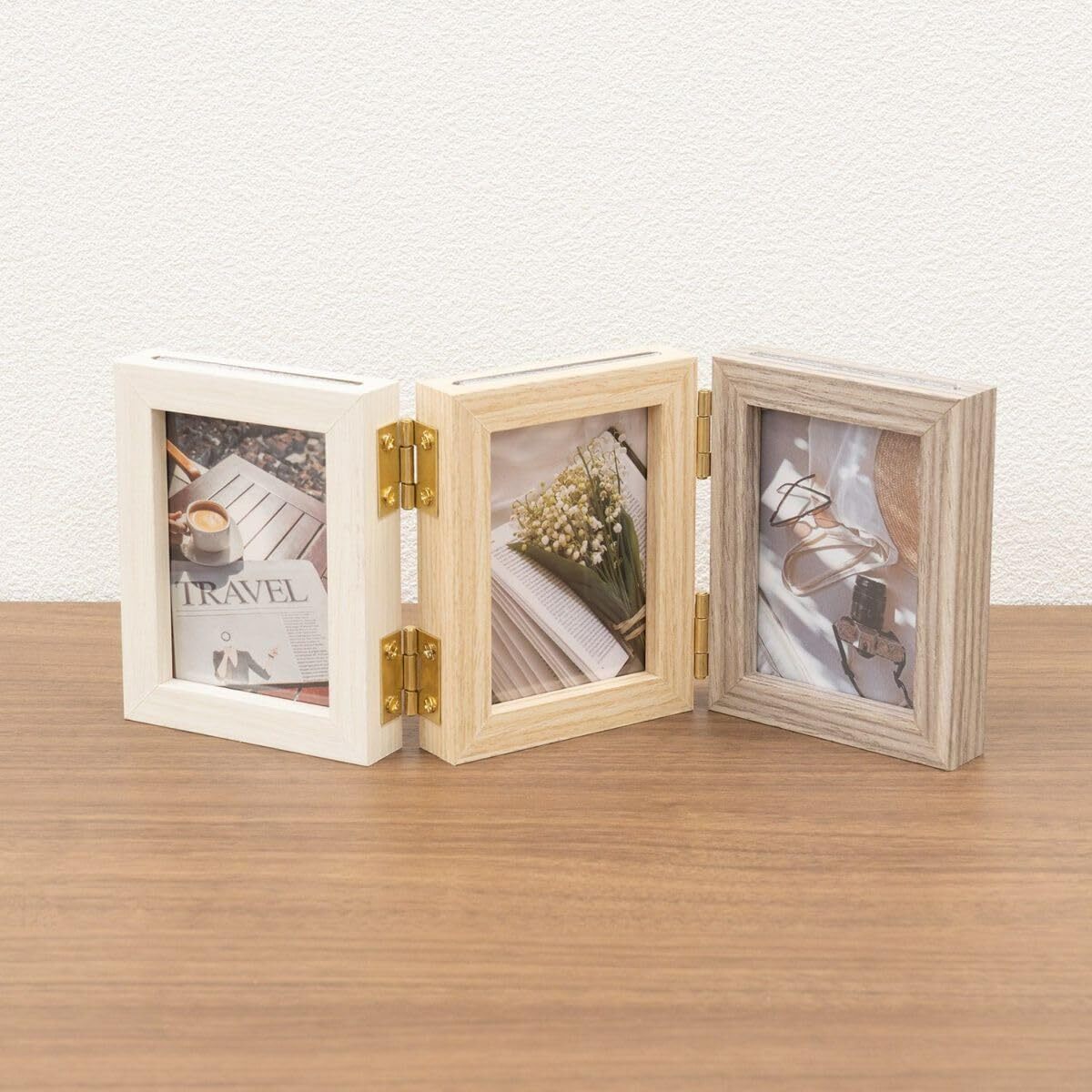 リンクフレームは、表裏の両面で写真を飾ることができるナチュラルな木製フレームです。 落ち着いたカラーの配色がお洒落でお部屋にもマッチします。 フレーム上部のスリットへチェキ、ハーフサイズプリントを挟んだ透明な板を差し込むようにして収納、表裏の合計6面に飾ることが可能。 使わないときには折りたたんでコンパクトに保管できます。 写真以外にも切り抜きや押し花など、透け感を活かした飾り方も楽しめます。 【仕様】 ■対応プリントサイズ:チェキサイズ、またはハーフサイズプリントの合計6枚 ■外寸:W80×H103×D18mm×3面 ■内寸:W65×H96mm×3面 ■窓寸:W56×H79mm×3面 ■前面板:ポリスチレン樹脂 ■重量:176g
