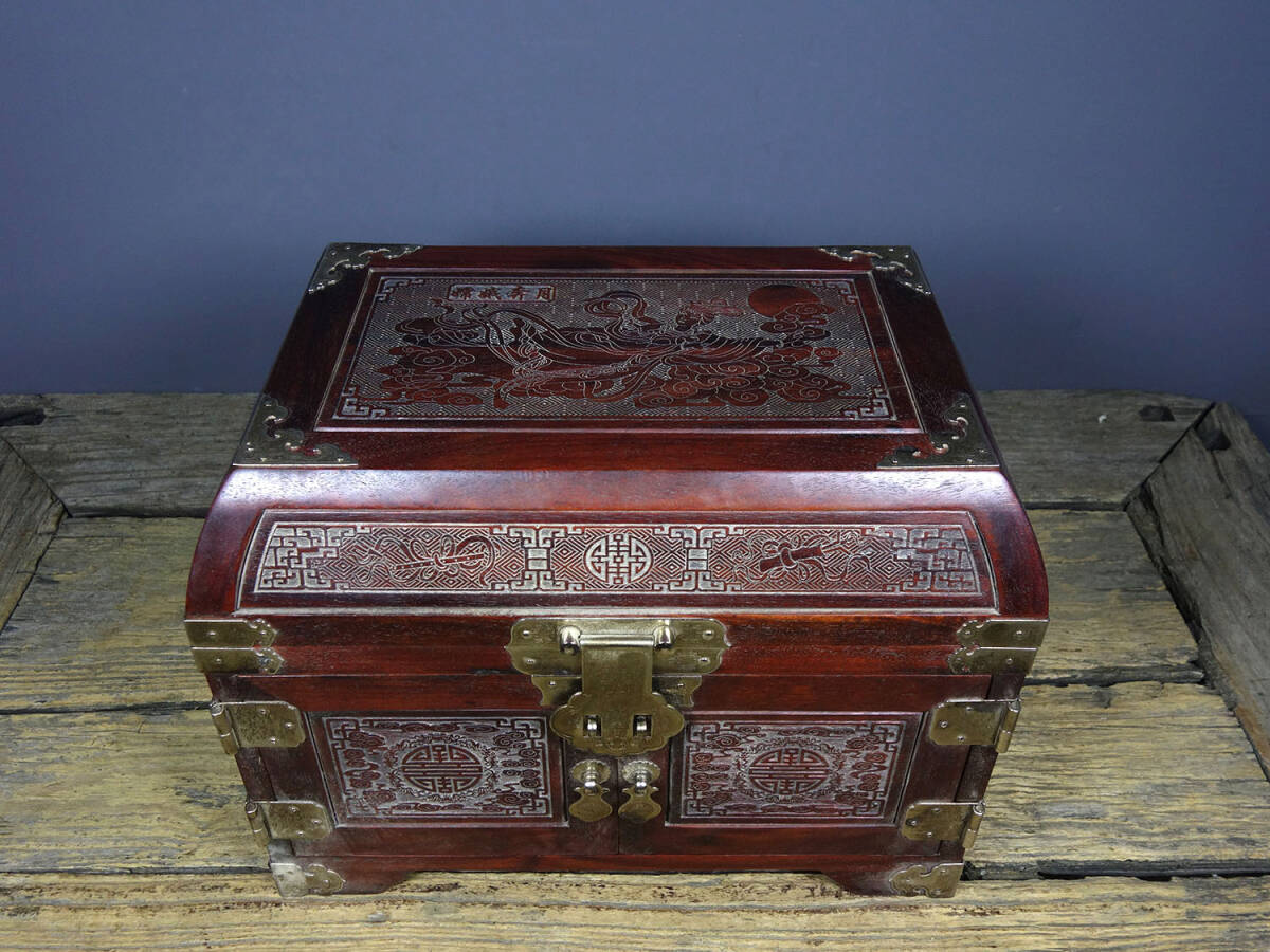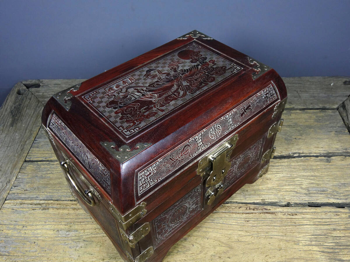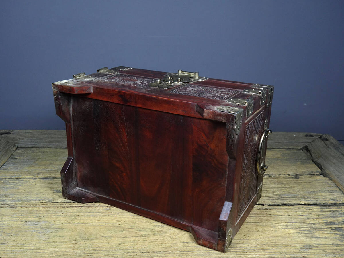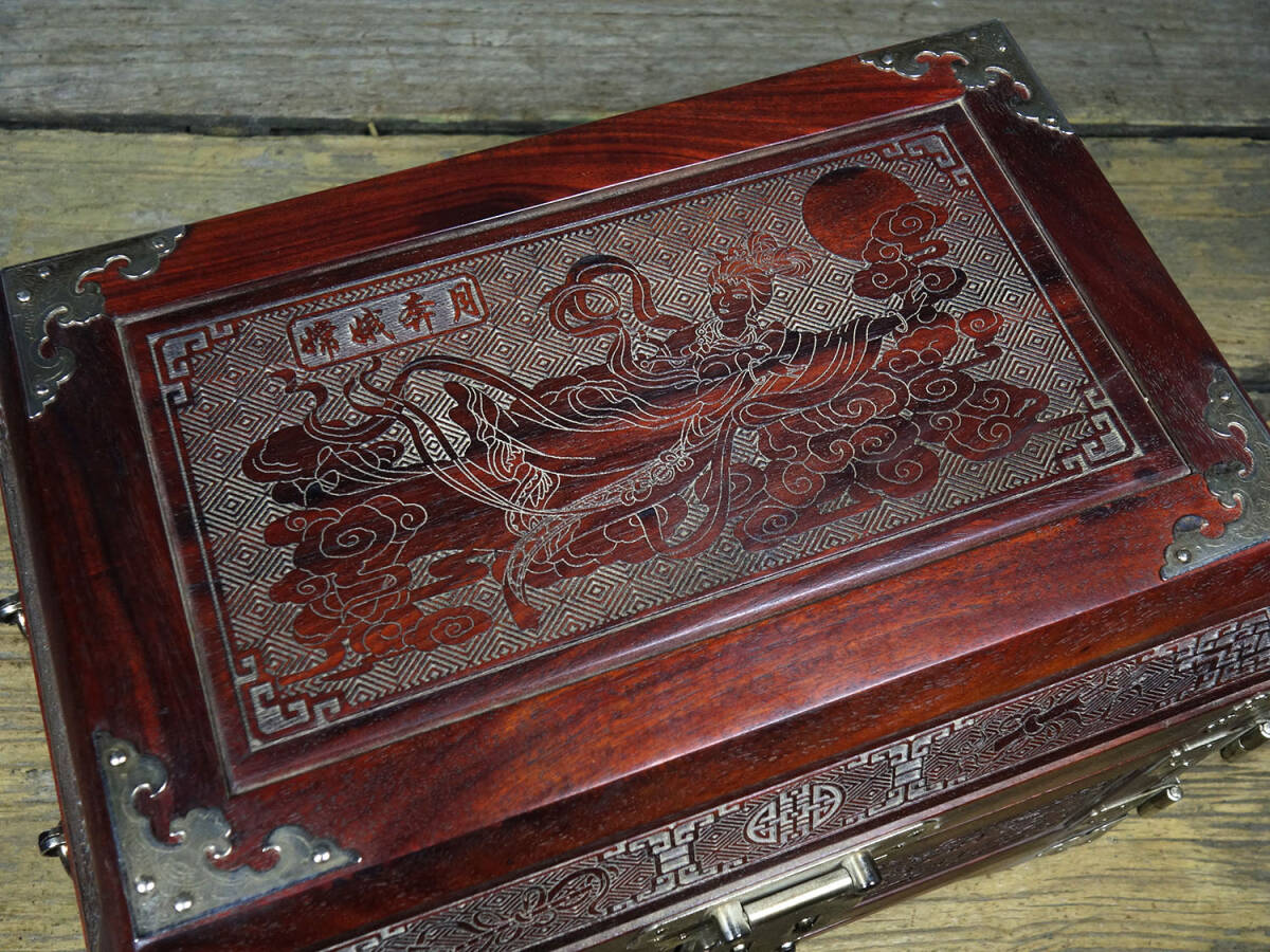 【超珍館蔵】紅酸枝木製 細密彫 四角包銅 嫦娥奔月紋 首飾盒 収納盒 置物 賞物 古賞物 古董品 古美術品 時代物 旧家蔵出 稀少珍蔵品