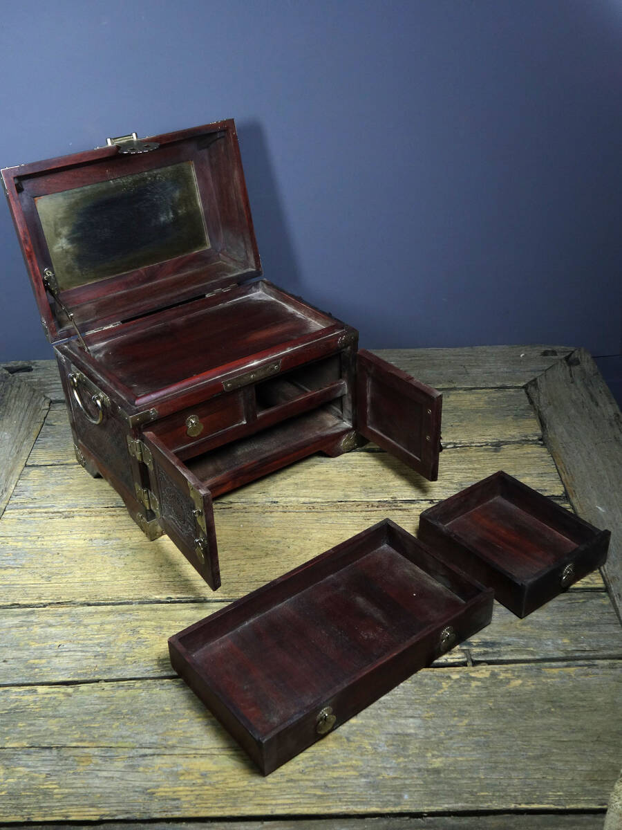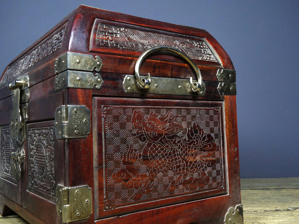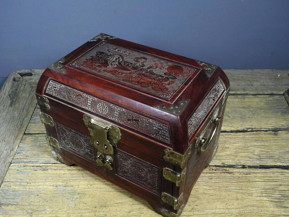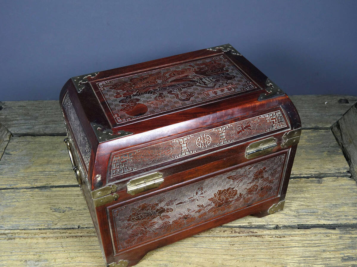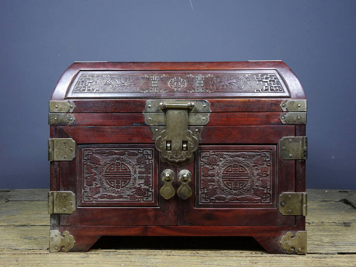 【超珍館蔵】紅酸枝木製 細密彫 四角包銅 嫦娥奔月紋 首飾盒 収納盒 置物 賞物 古賞物 古董品 古美術品 時代物 旧家蔵出 稀少珍蔵品