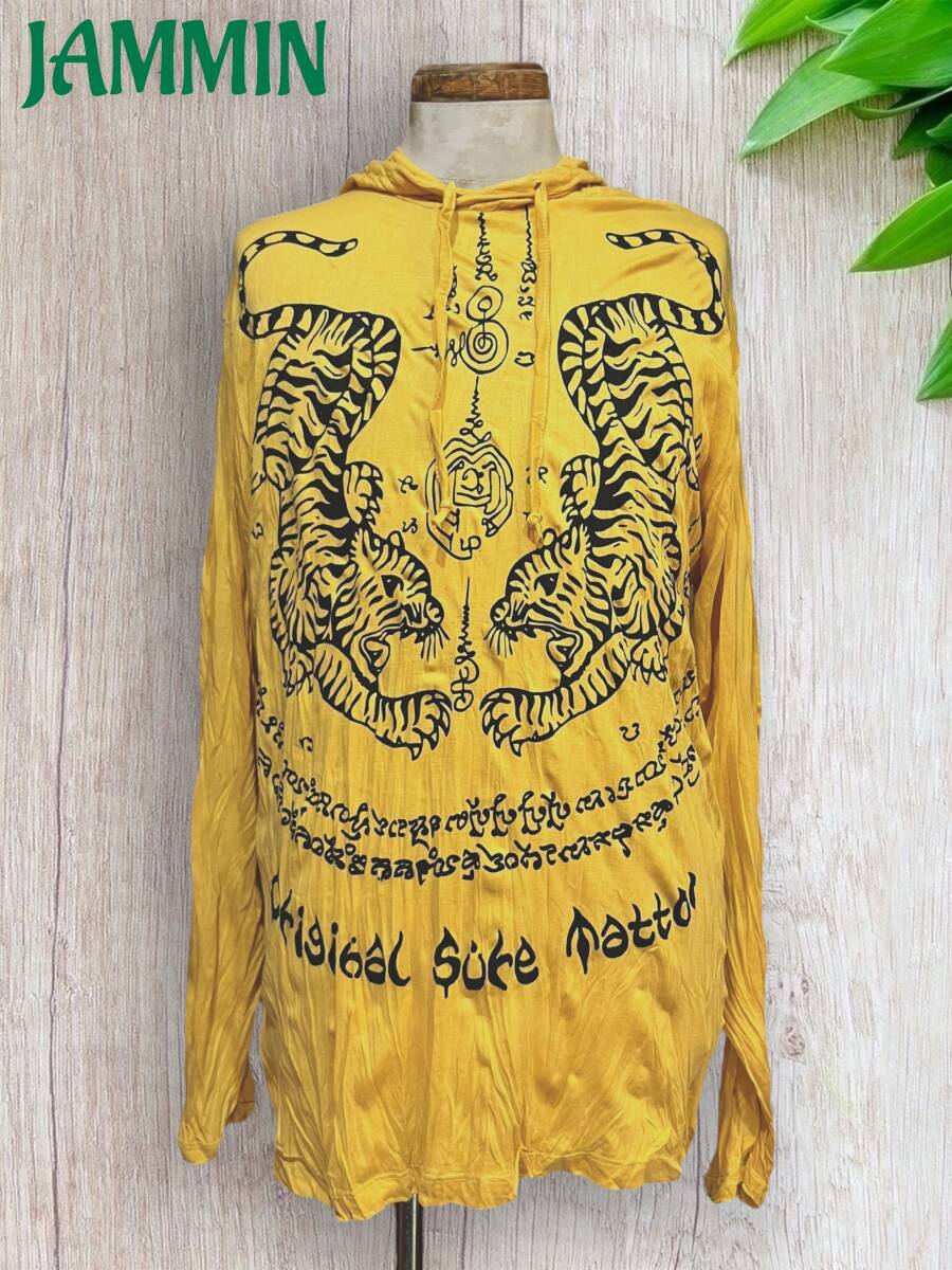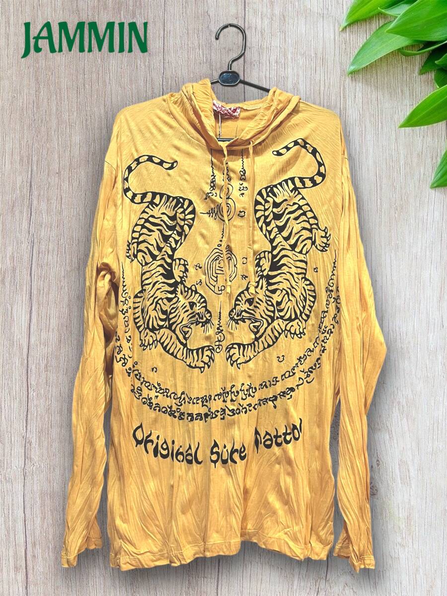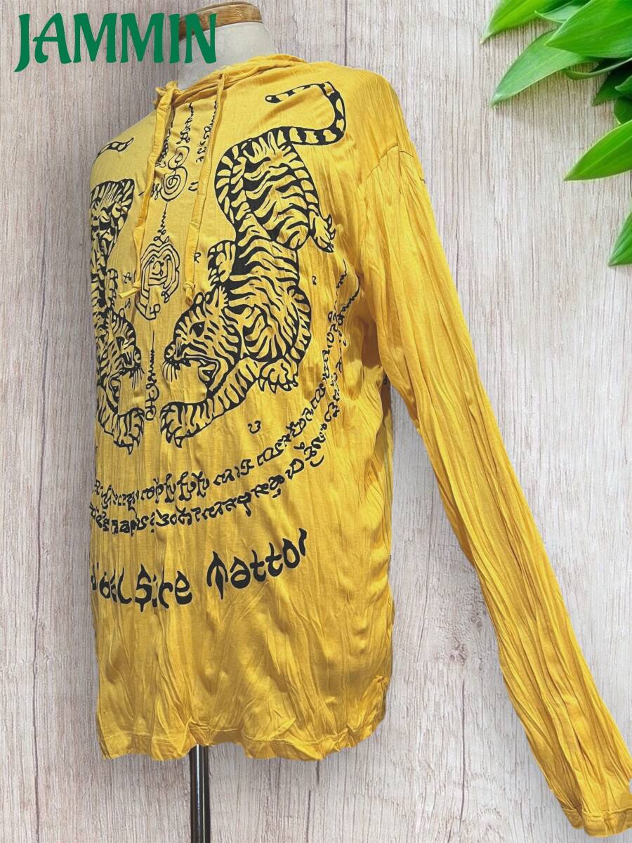 アジアン/エスニック/サイケ/ヒッピー/個性派/ロンT/長袖/Tシャツ/ロングスリーブTシャツ/フード付き/長袖/Lサイズ/虎/タイガー/サクヤン