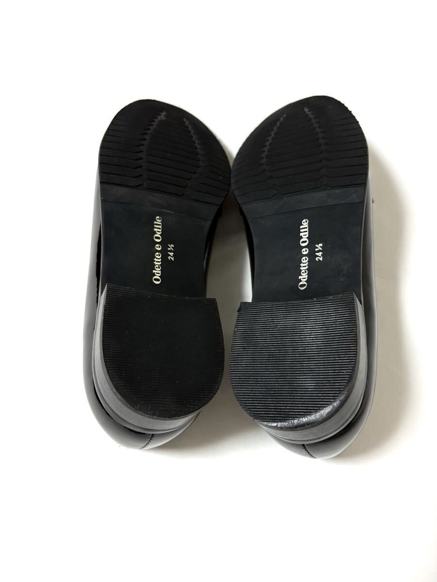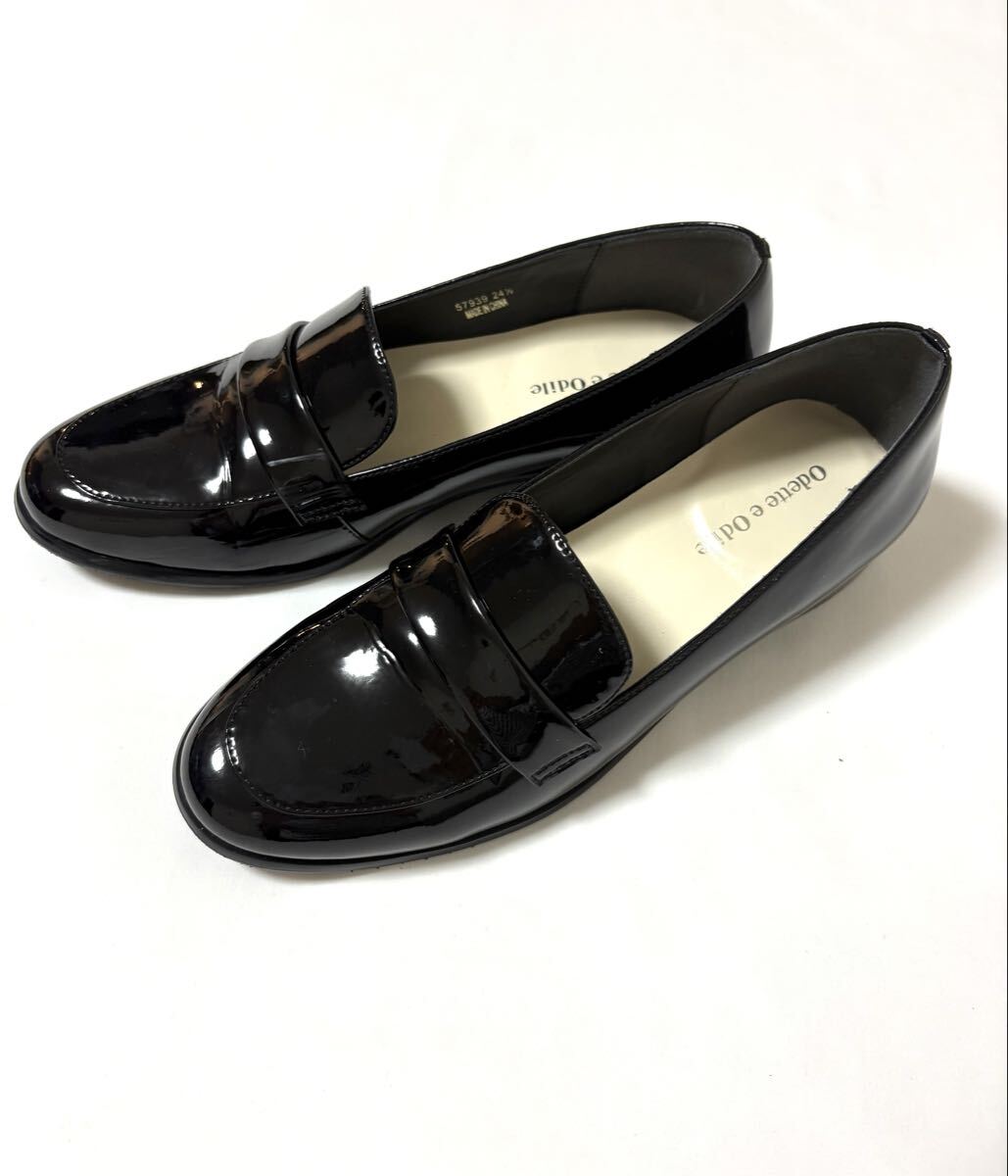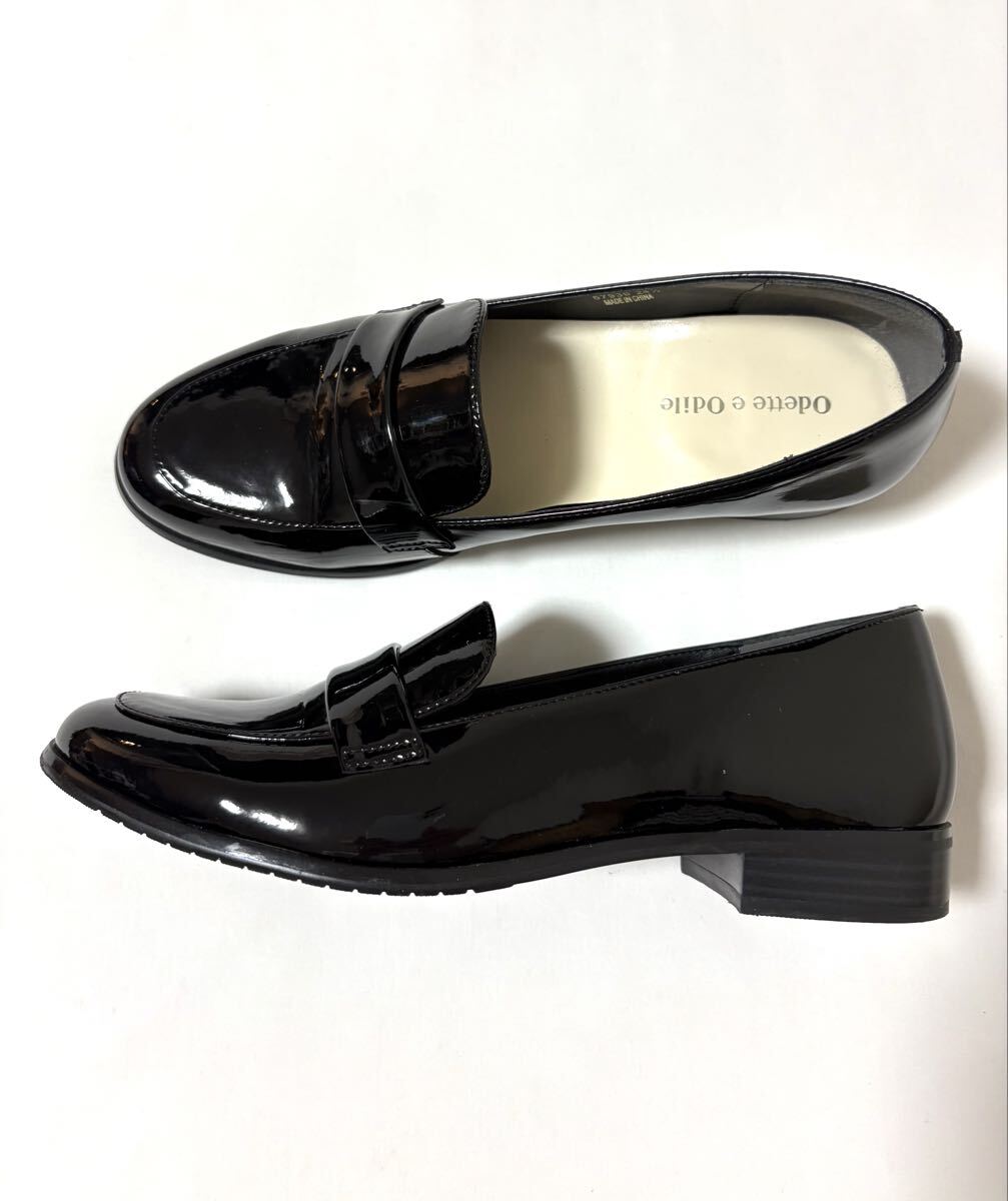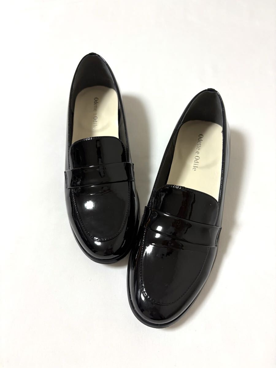 「オデットエオディール」のローファーです。サイズ・・・24,5cm。カラー・・・黒。素材・・・エナメル。ヒールは約2.5cm。くせのない綺麗なシルエットのローファーです。インソールはクッション性もあり、足にやさしいです。数年前に購入し、何度か使用しました。内側に少し擦れ跡があり、多少ヒールの擦れもあります。(それぞれ写真でご確認ください)。全体の状態は悪くないとは思いますが、あくまでユーズドですので、神経質な方はご遠慮ください。箱はありません。よろしくお願いいたします。