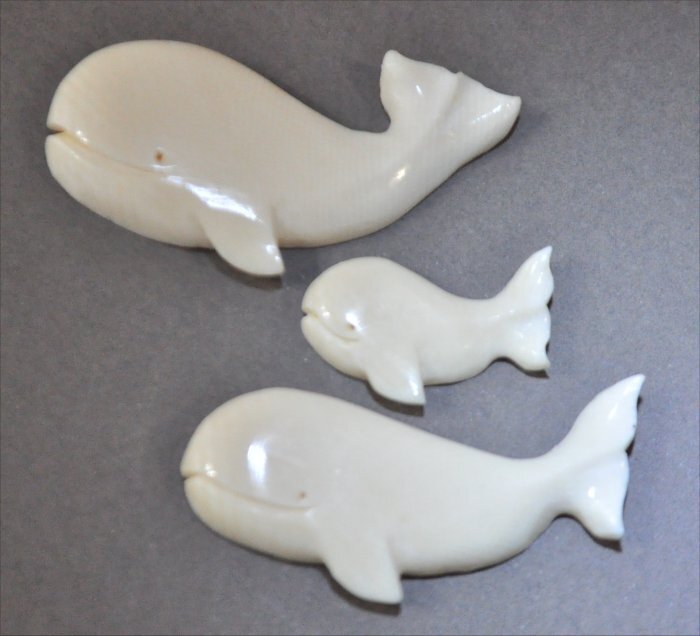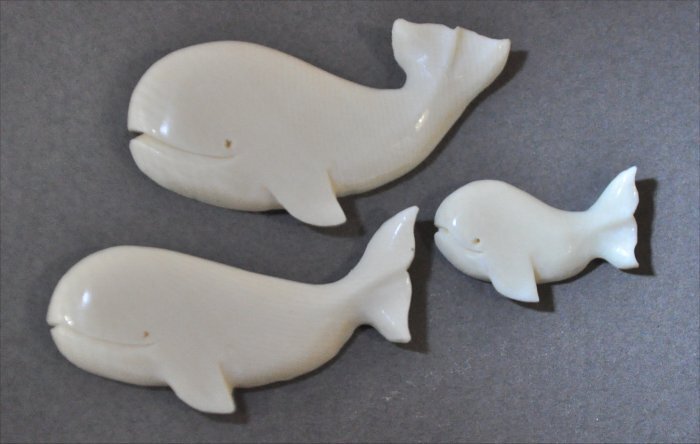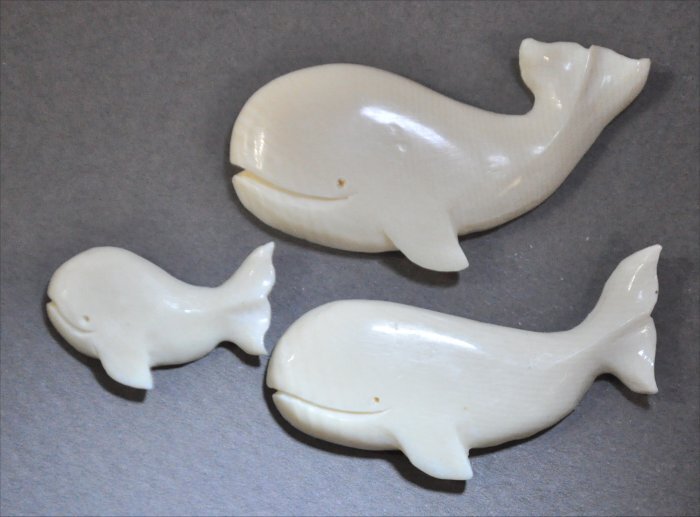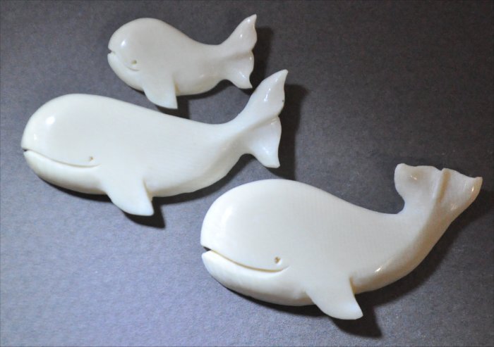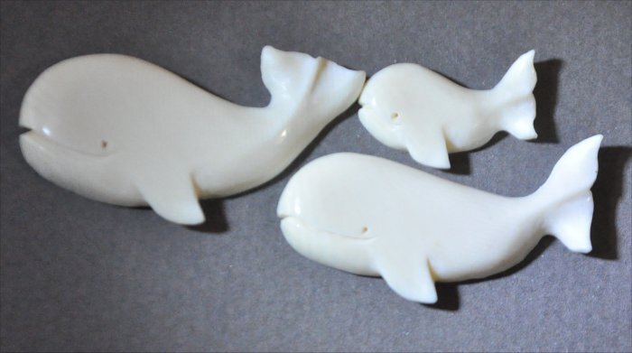 ナンタケットバスケット用のマンモス牙のクジラ家族3頭のオーナメント