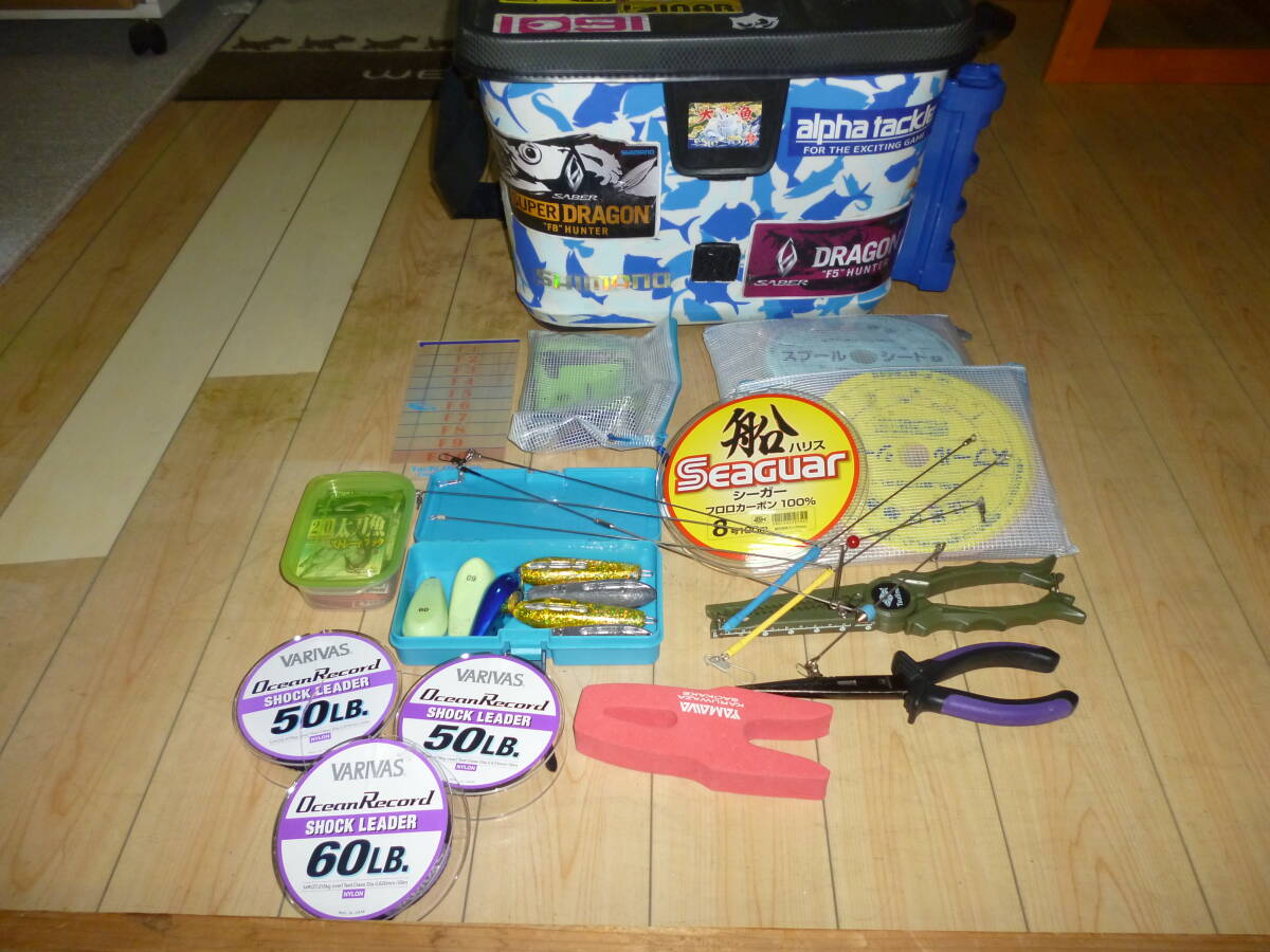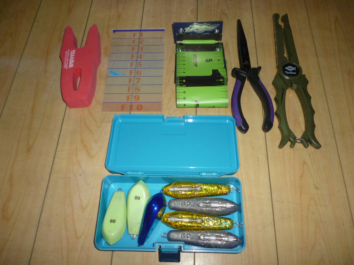 おもりは走水のタチウオ仕様で60号 天秤、ドラゴン用メジャーと撮影用サイズ、フィッシンググリップ、ロングペンチ、針、少し残ったナイロン