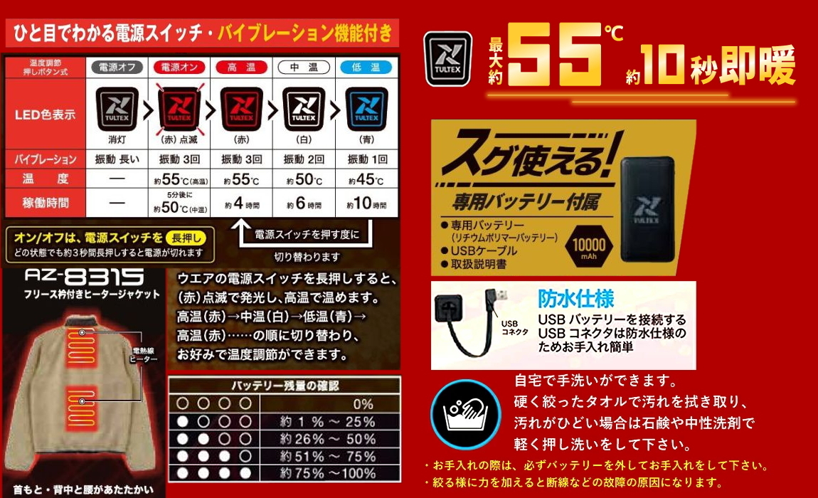| 商品情報 | 未使用 ■セット内容 〇ボアフリースヒータージャケット 〇モバイルバッテリー(10000mAh) 〇本体充電用 USB-A to C ケーブル・取扱説明書 ■仕様 【ジャケット】 ◇素材 表地:ボアフリース ポリエステル100% 裏地:トリコット起毛 ポリエステル100% 別生地:ナイロンタスラン ナイロン100% |