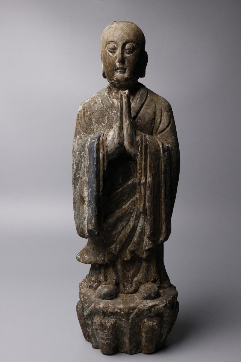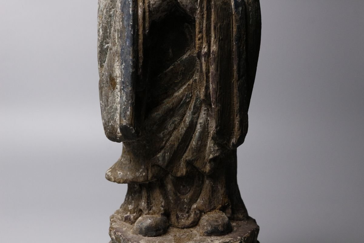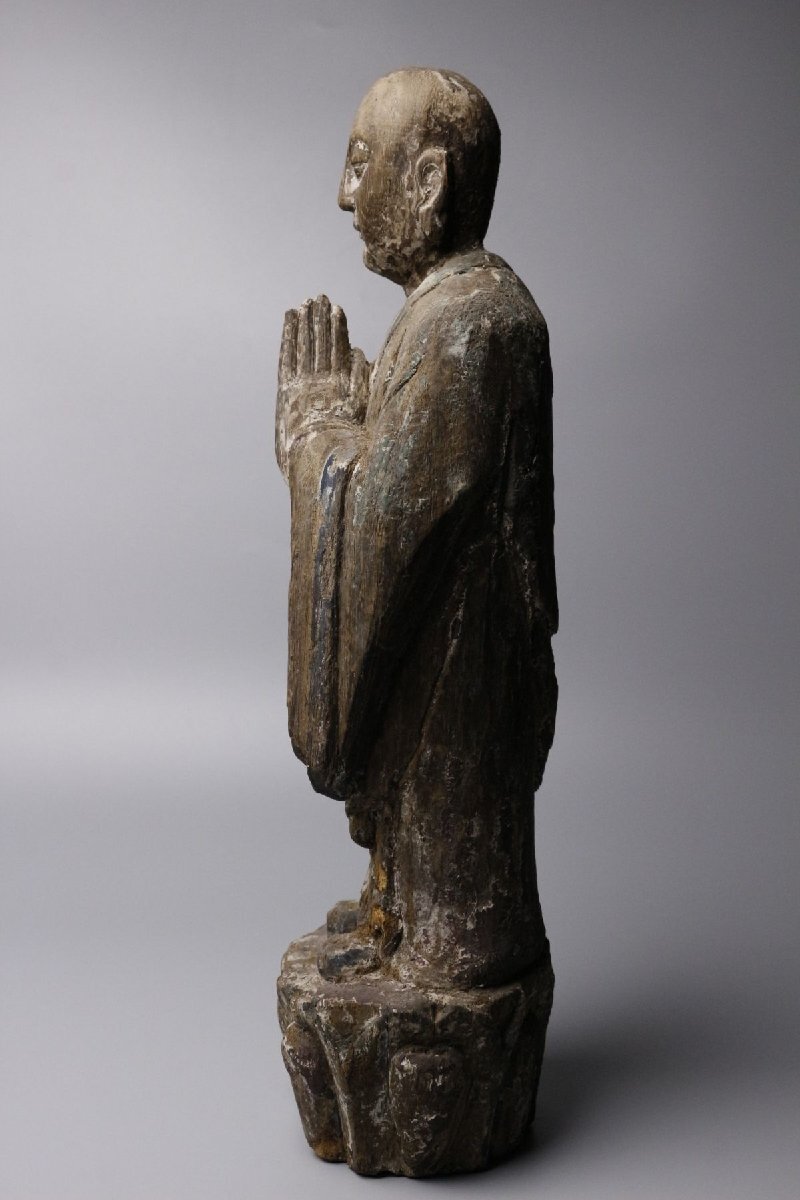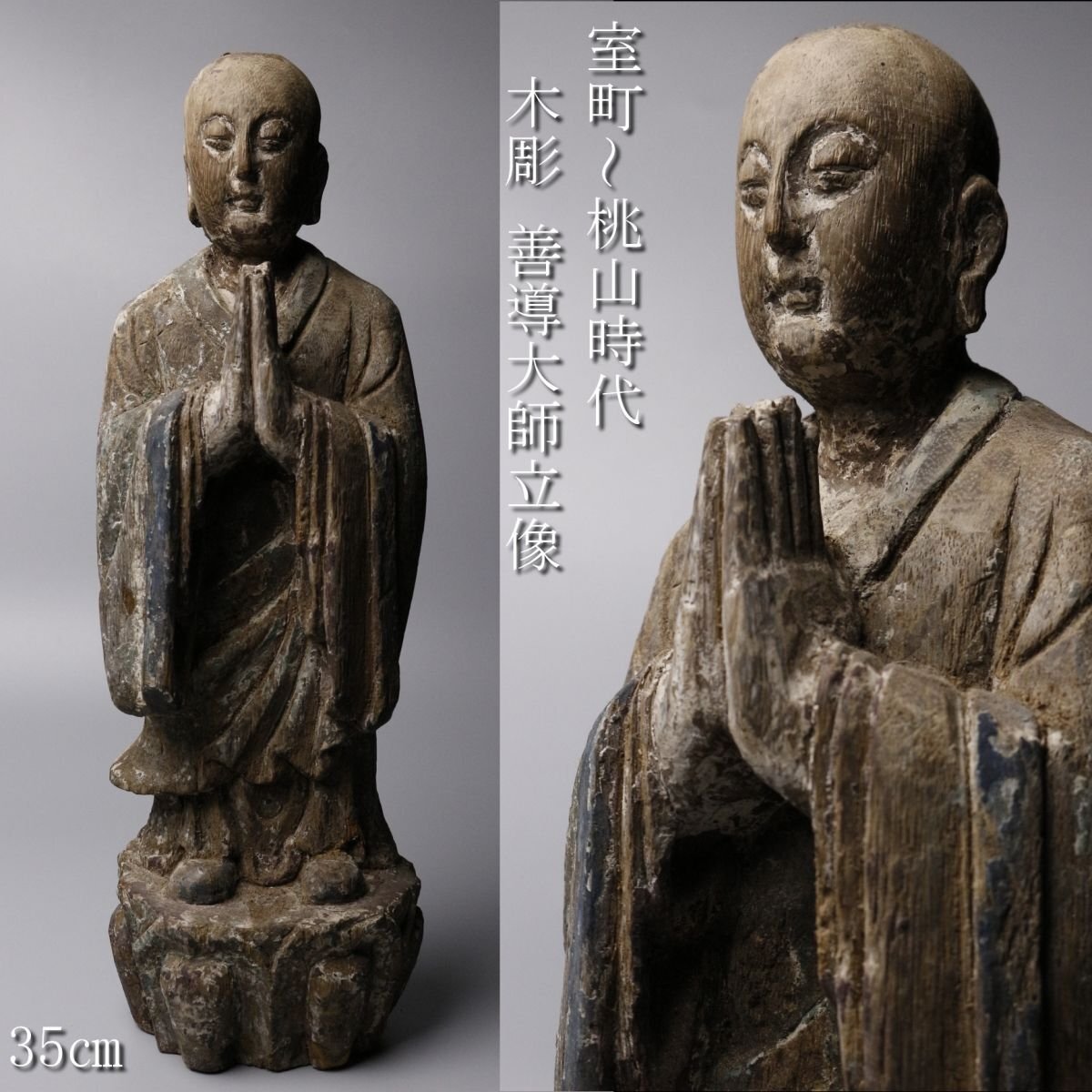 * * * 商品詳細 * * * ここでしか出逢うことのできない唯一の美をご紹介させて頂きます。 悠久の年月を感じさせる木の地肌が味わい深い 木彫 善導大師立像のご紹介です。 善導大師は中国唐代初期に活躍した、中国浄土教(浄土宗)の基礎を確立した人物で、 日本の法然上人にも絶大な影響を与え、浄土宗では「浄土五祖」の第三祖とされています 目を閉じながら大きな手を高い位置で合わせて拝む様子は 神秘的であり信仰心の表れのようでもある神々しいお姿をしています。 風格感じる木肌は経年を経ることによる変化を感じさせる時代の逸品です。 この機会に是非、お手元にてご堪能ください。 ■サイズ/横11.5㎝×高35㎝×奥行9㎝ ■状態/ スレ、傷、欠け、割れ、剥げ、腐食、経年による傷みがございます。 ※写真にてご確認、ご了承の上ご入札下さい。