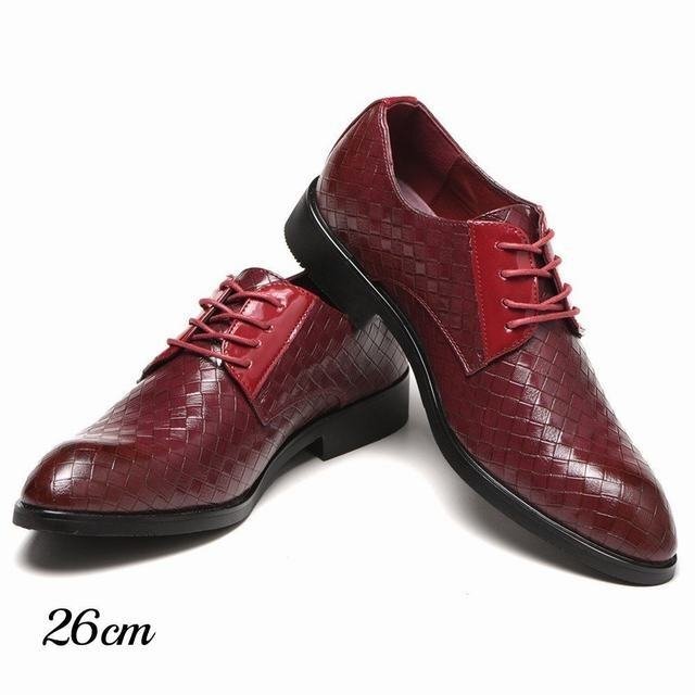 ビジネスシューズ メンズ シューズ 紐靴 PU革靴 ロングノーズ 編み柄 紳士靴 オシャレ レースアップ ワイン 26cm