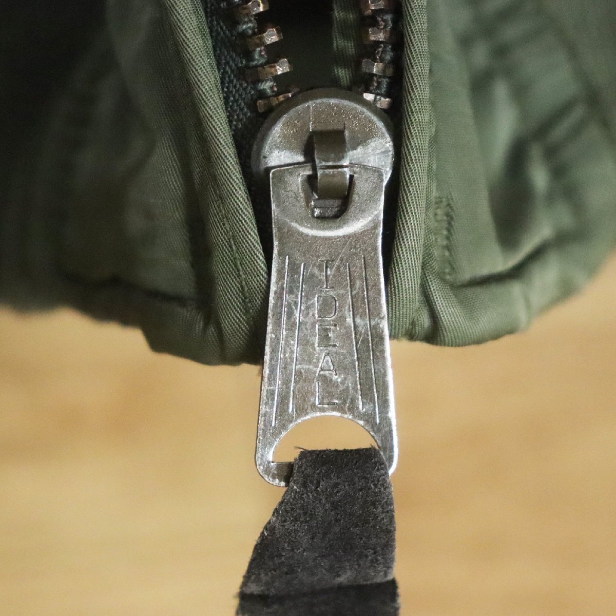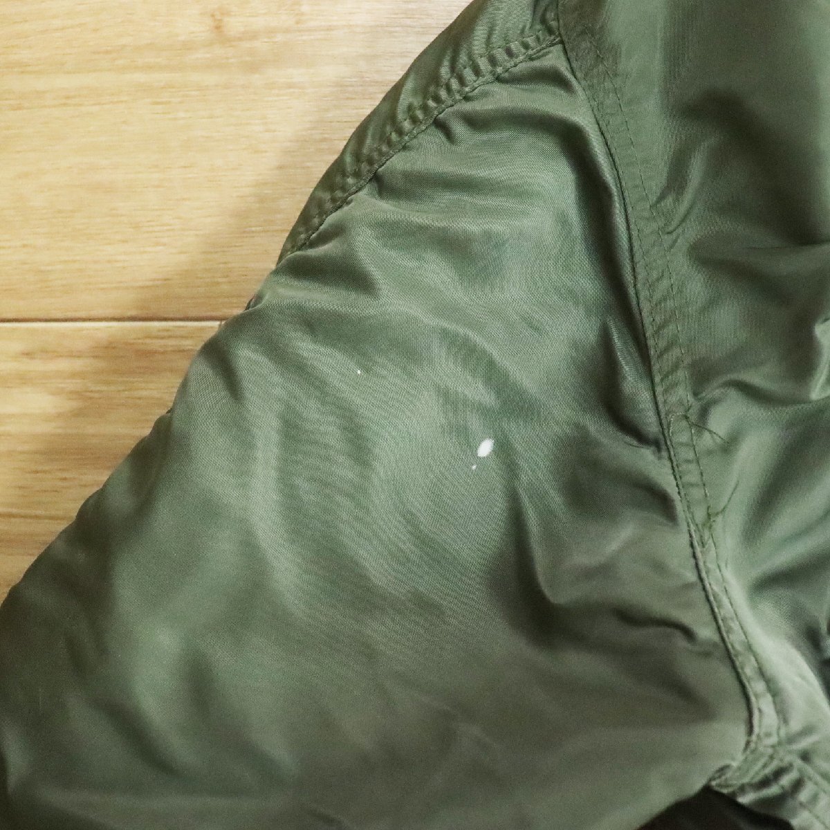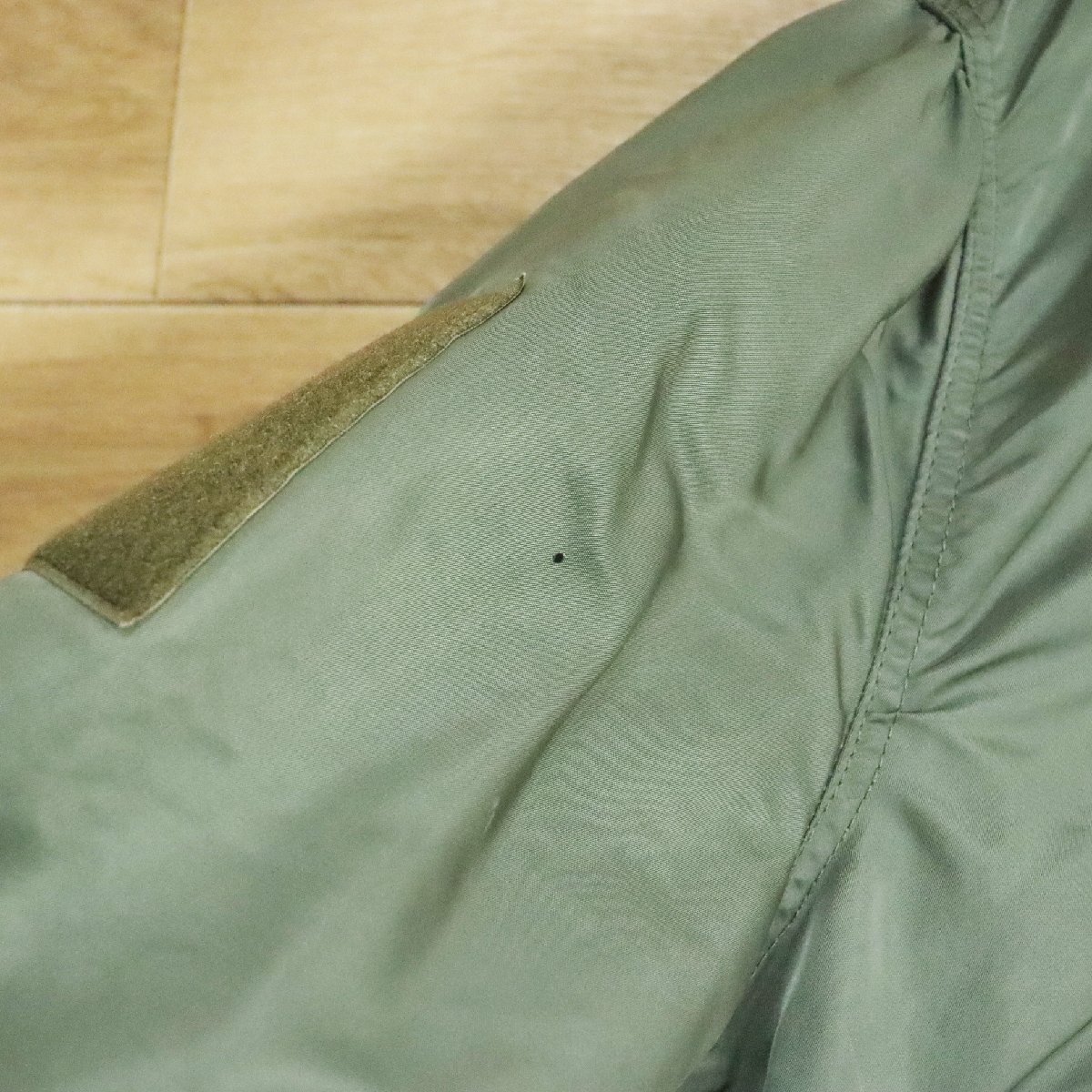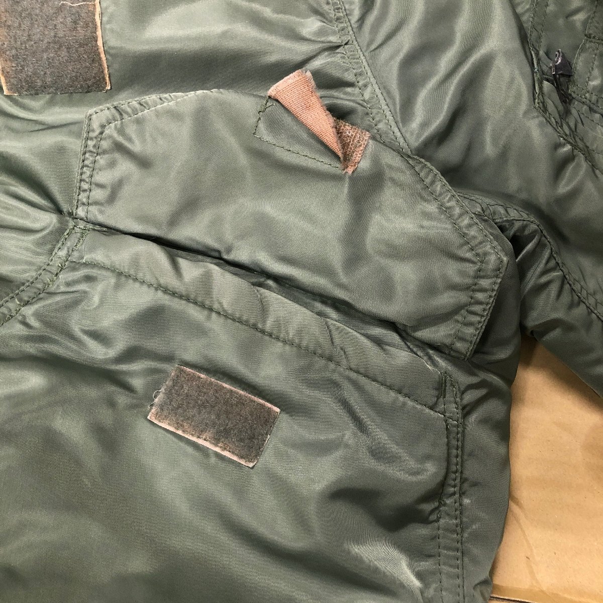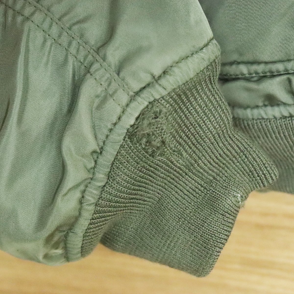 中古品です。使用感があります。各部に小さな擦れ、左袖や右ポケットに薄汚れ、右袖や右肩に小穴、袖リブにホツレやリペア跡、裏地に色褪せや擦れ破れ、襟裏にマジックテープが後付けされています。