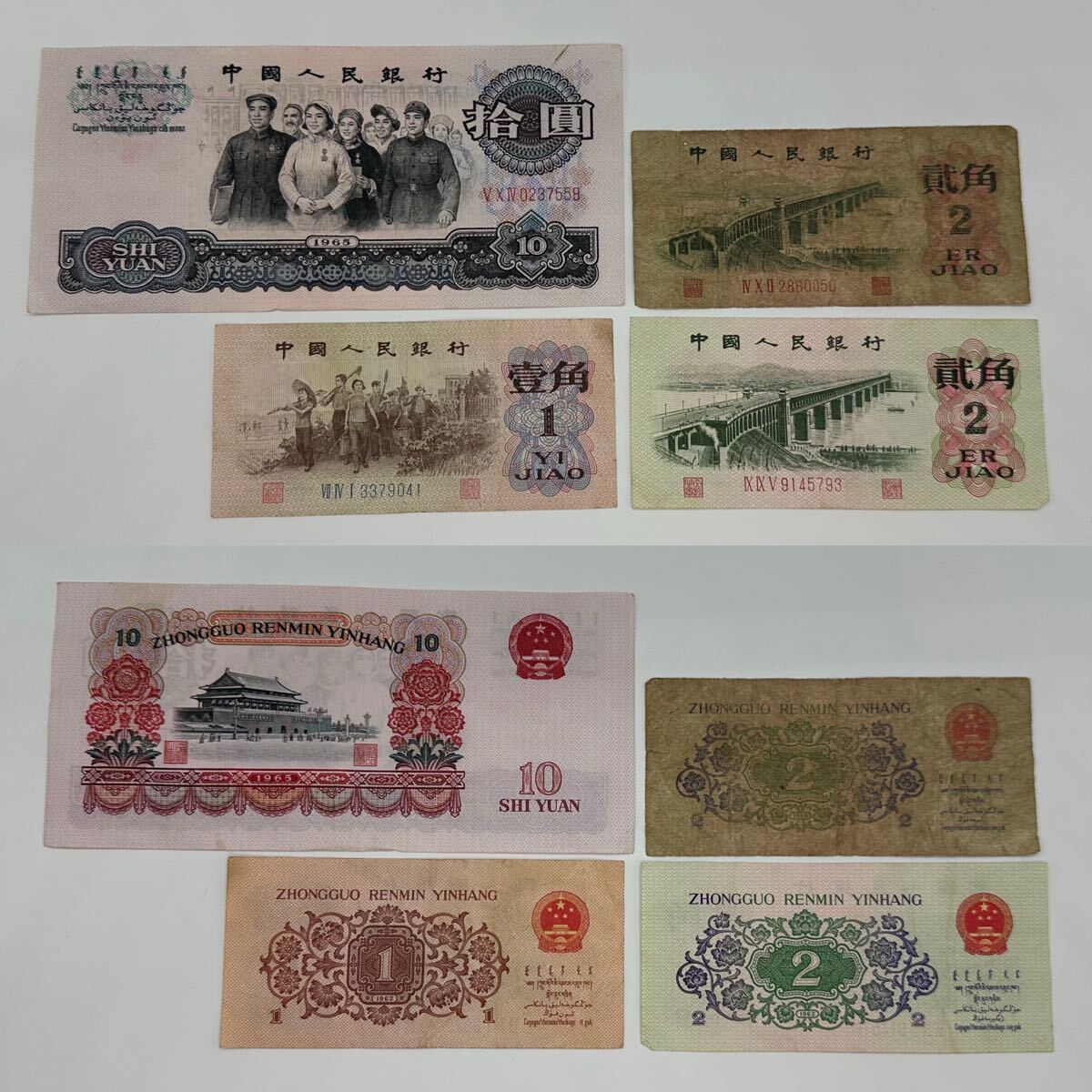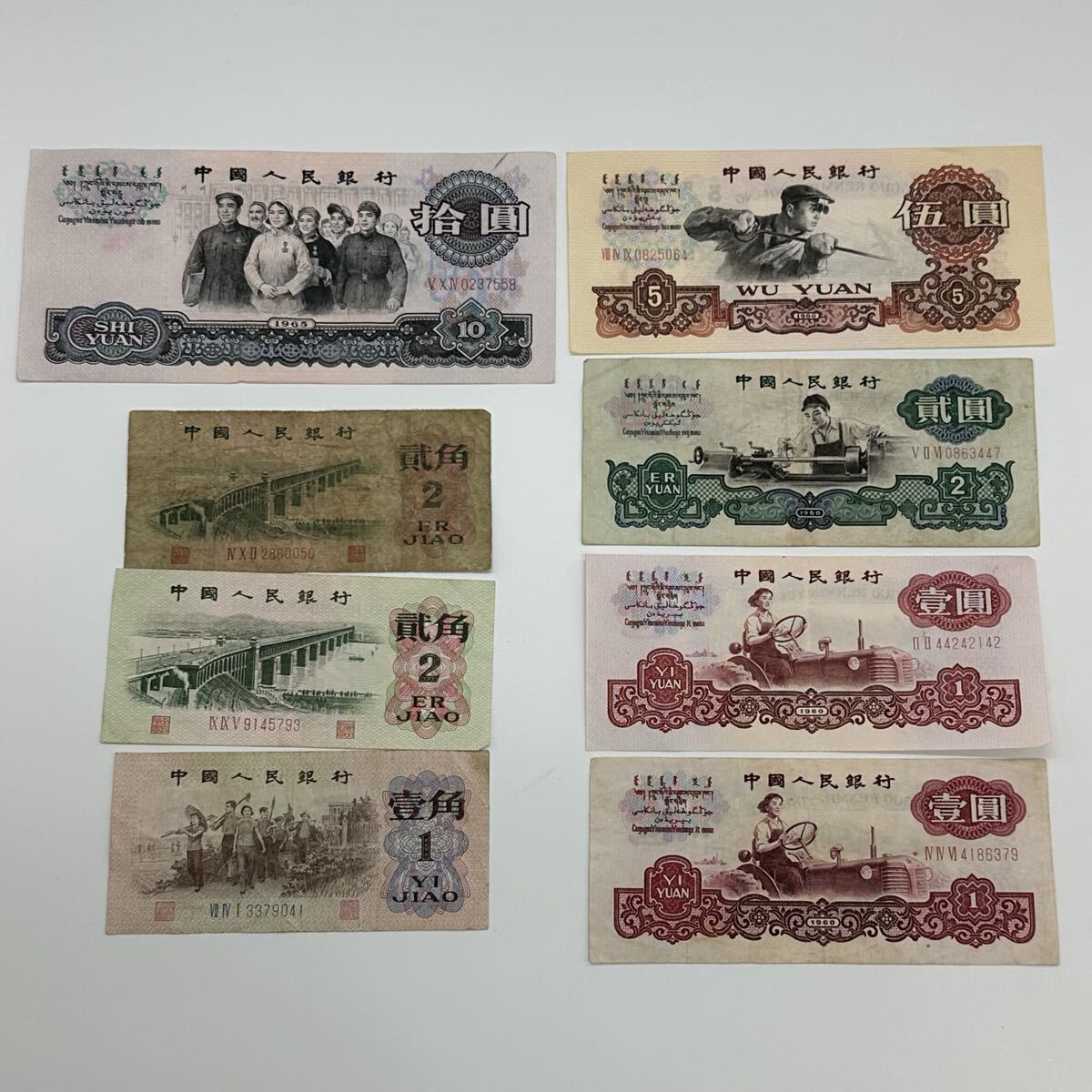 【9S51】1円スタート 中国人民銀行 1960年 1965年 伍圓 貳圓 壹圓 拾圓 貮角 壹角 まとめて8枚 中国 古紙幣 旧紙幣 星透かしあり