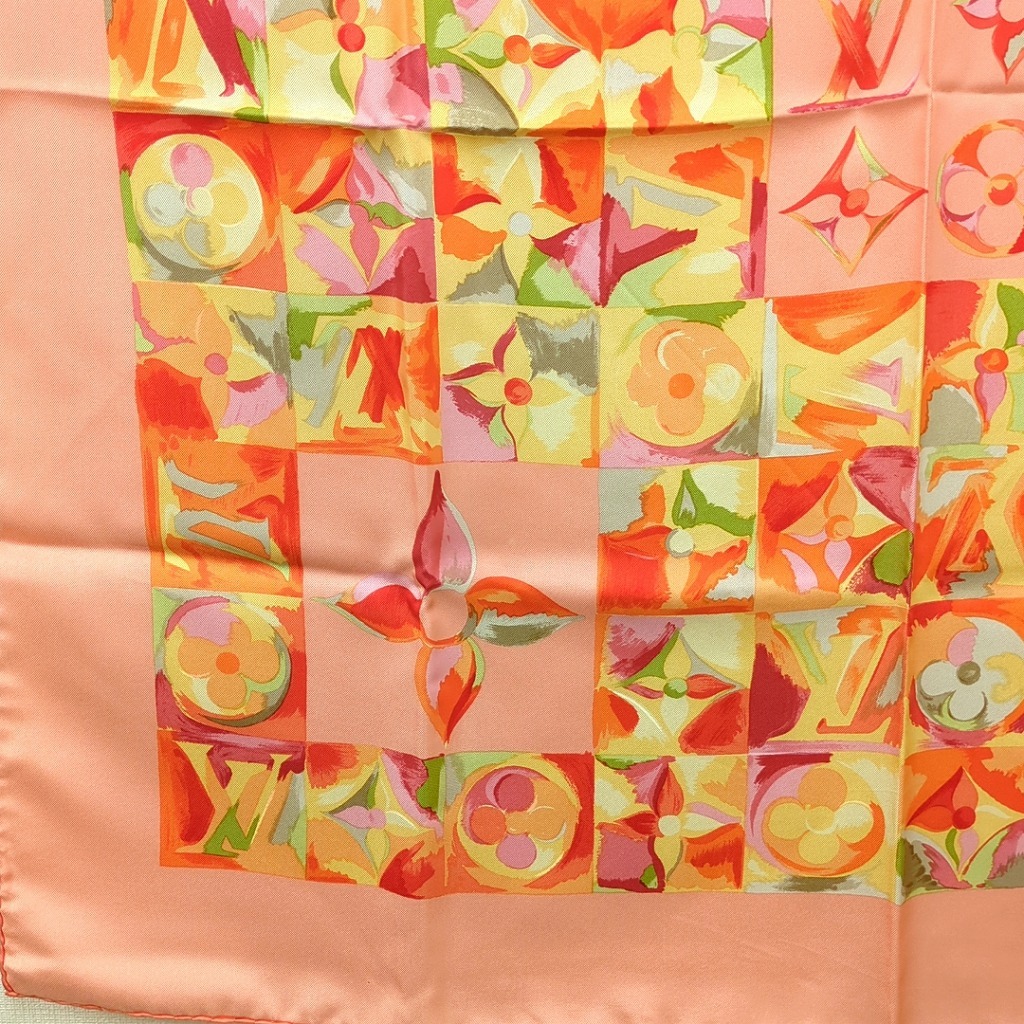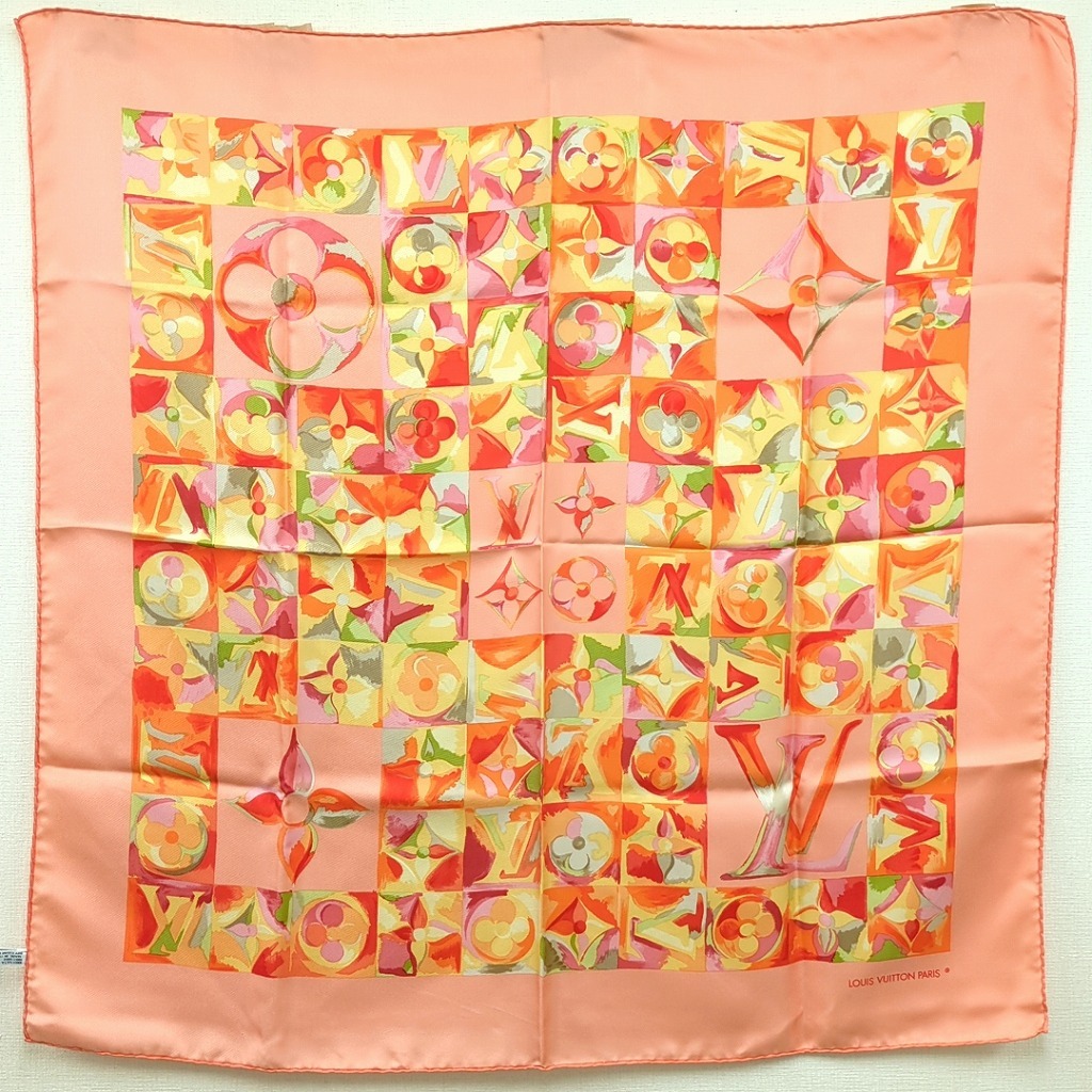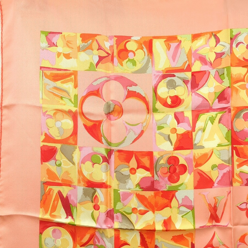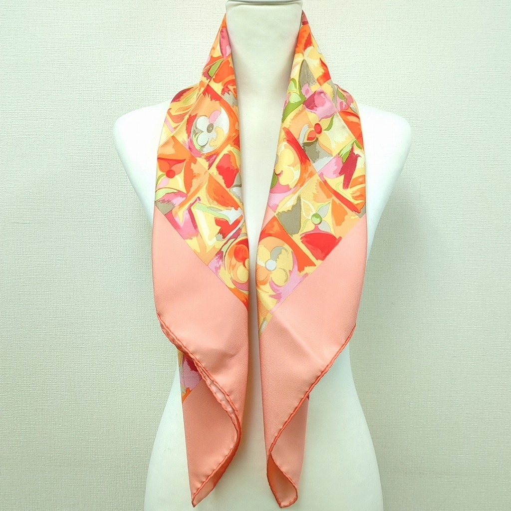 1006-1oji17325 ルイヴィトン 時の流れに CARRE AU FIL DU TEMPS モノグラム フラワー ピンク オレンジ シルクスカーフ イタリア製 【コンディション】 ほつれと伝線、ちいさな汚れ、1か所に小さな穴あり。その他目立つ汚れやキズはありません。 中古品ですので写真の状態をよくご覧ください。 【サイズ】 縦約86cm、横約86cm 多少の誤差はご了承ください。 【付属品】 なし