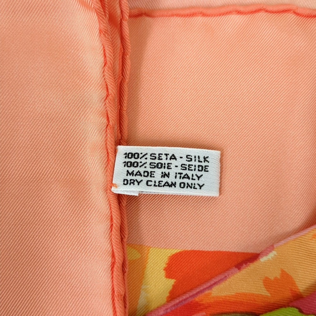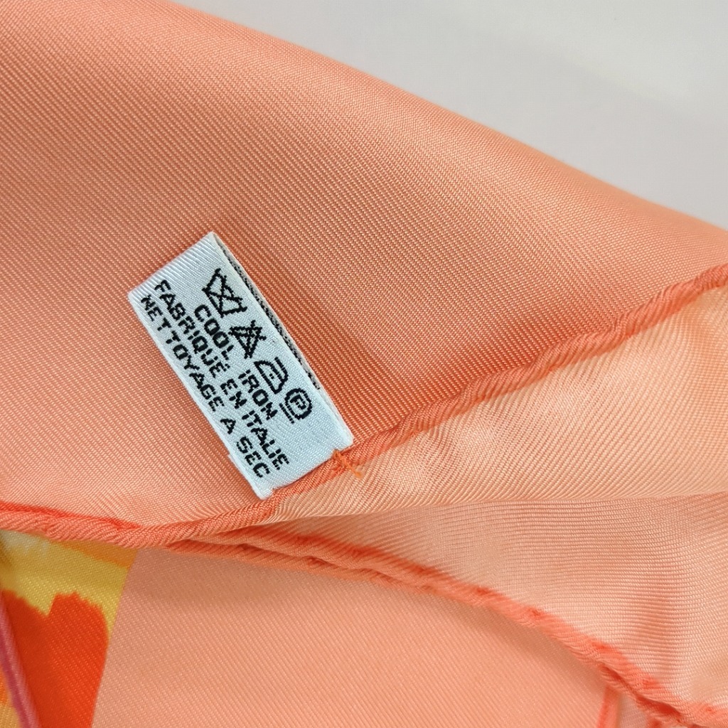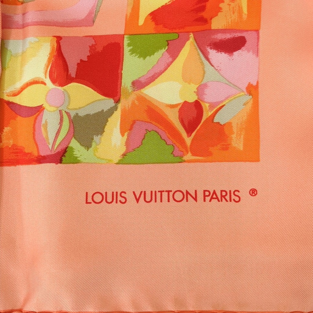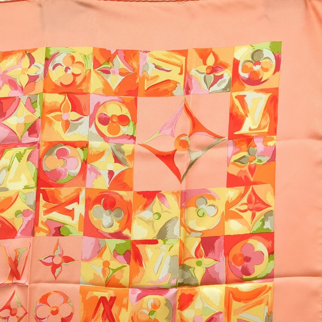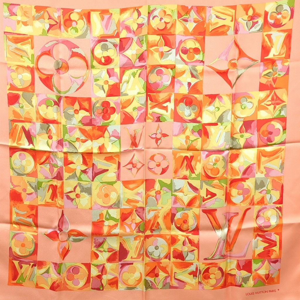 1006-1oji17325 ルイヴィトン 時の流れに CARRE AU FIL DU TEMPS モノグラム フラワー ピンク オレンジ シルクスカーフ イタリア製 【コンディション】 ほつれと伝線、ちいさな汚れ、1か所に小さな穴あり。その他目立つ汚れやキズはありません。 中古品ですので写真の状態をよくご覧ください。 【サイズ】 縦約86cm、横約86cm 多少の誤差はご了承ください。 【付属品】 なし