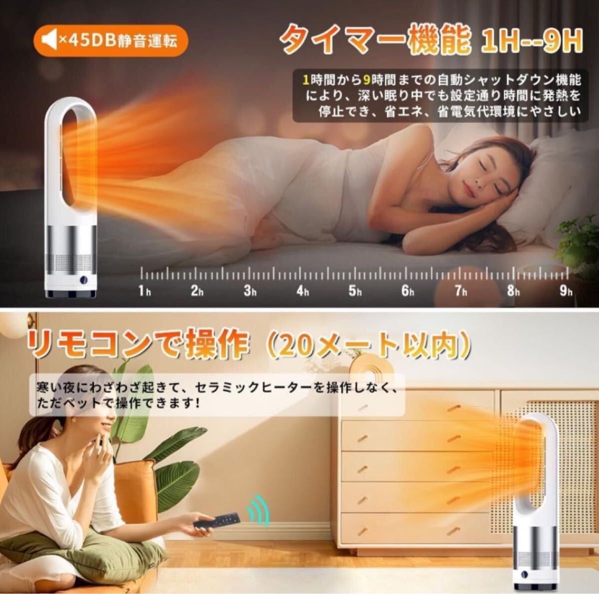 リモコン付き 【温風・冷風両用】本セラミックファンヒーターは三段階の温風と10階段の送風を自由に切り替えられて便利です。寒い冬に、温風で寒きを遮断しながら、屋内を迅速に暖かくさせます。暑い夏に、強風モードで10階段の涼風を与えてくれ、究極の熱中症対策です。扇風機とヒーターが一体型になった羽なしセラミックヒーターが機能性や省エネで、一年中にお役に立てます。 【3段階暖風&8段階送風切替&100度首振】扇風機は自動首振り機能が付き、本体を動かさなくても広く送風できます。そして、送風モード、低温風モード、高温風モード、三つのモードがあります。3段階暖風・8段階送風、お好みの暖かさに自由に調節できます。夜中に起きても、タワーファンが傾いた転倒下時にヒーターが自動的にオフになります。  【2秒速暖&異臭なし】PTCセラミック発熱材料を採用したミックファンヒーターは電熱転換率が高くて電源を入れると、2秒で温風が放出、部屋が暖かくなります。また、ガスやオイルなどの燃料を使用しないので燃費ゼロ!異臭なしで子供部屋でも使用できます。 【9時間タイマー機能&低騒音操作】タワーファンは新しくアップグレードされたセラミックヒーターは、45dB以内の騒音で動作し、一晩中静かで暖かい環境で眠らせる超静かな機器です。タイマー機能を備え、1時間から9時間までの自動シャットダウン機能により、エネルギー効率が更に向上し、環境にも配慮します。 【2waysコントロール&多重保護機能】近い距離で、ワンタッチボタンで色々な操作でき、便利です。また、ファンヒーターには感度20メートルのリモコンが搭載されており、寒い冬にベッドやソファーから離れずに指先で簡単に操作できます。座ってるママの操作、年寄の方も簡単に使えます。多重保護機能搭載:①転倒自動OFF機能:地震や不注意で転倒しても、セラミックヒーターが自動に電源OFFになります;②加熱保護機能:温度は65°以上になると、セラミックヒーターが自動に電源OFFになります;③ 高品質耐燃材料:V0級耐燃材料で、長時間利用しても、焼けや臭など匂いしません。④羽根なしデザイン:羽根がないため、子供が触れても、大丈夫です。また、清潔も簡単になります。