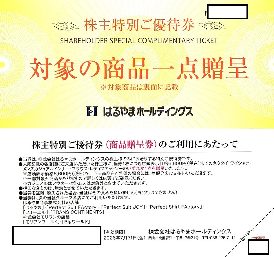 はるやまホールディングス 株主優待券 商品1点無料券(ワイシャツ・ネクタイ等) 1枚(単位) ~4枚迄 2026年7月末迄有効