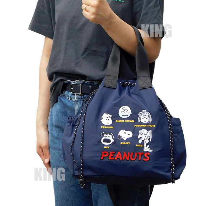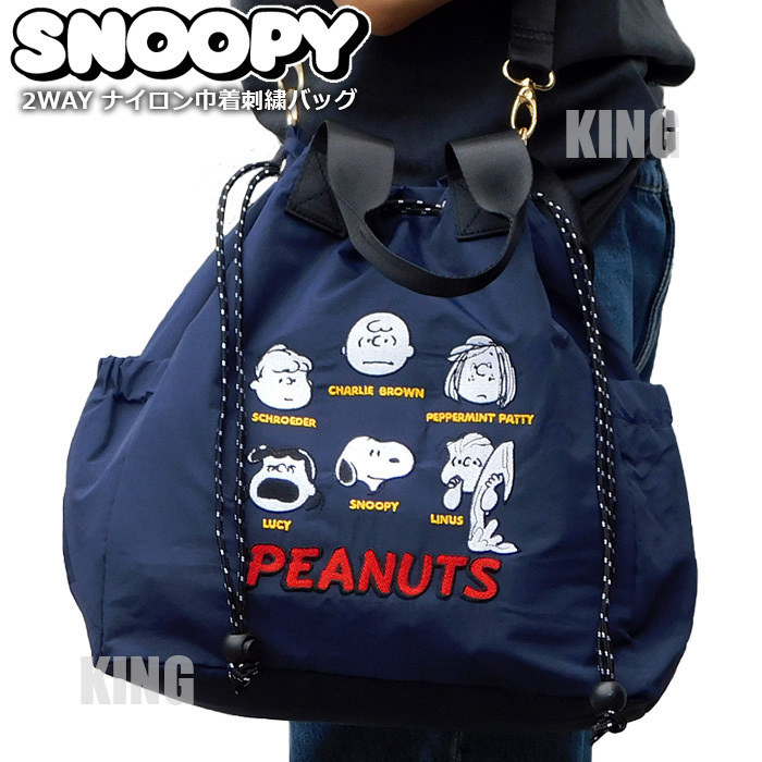 送料無料 スヌーピー 2WAY ナイロン 刺繍 巾着バッグ ショルダーバッグ レディース 斜めがけ 肩掛け ドローストリングバッグ SNOOPY 紺色■