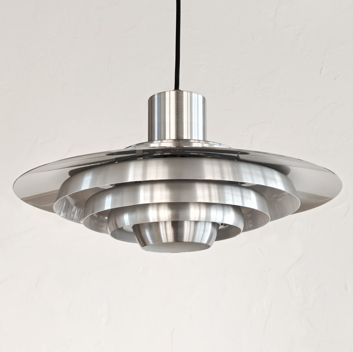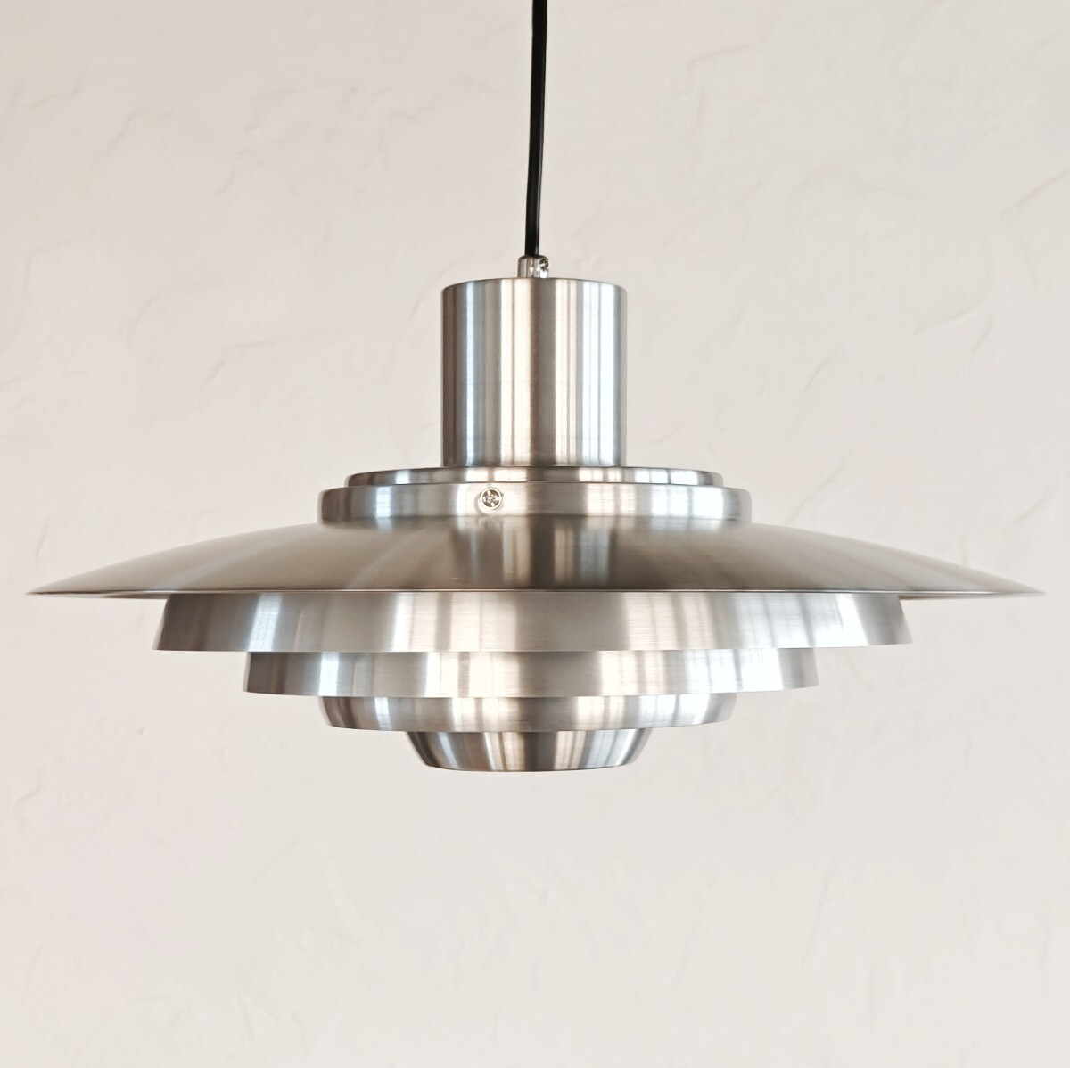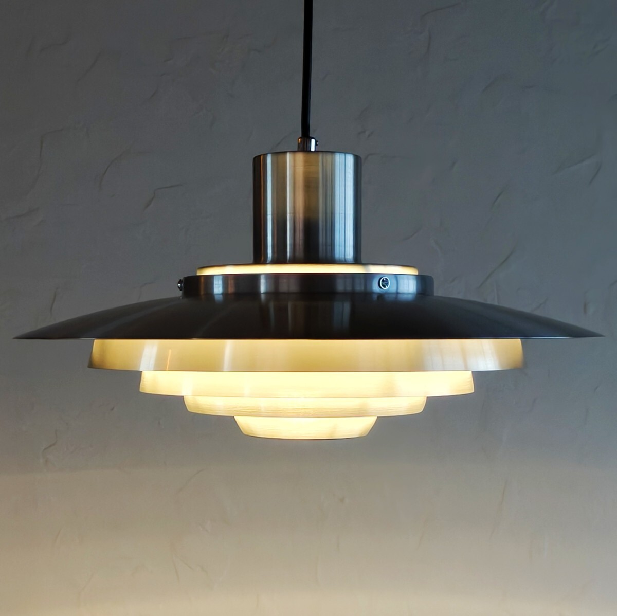 段々に幾重ものシェードが重なり合った形が印象的な「P376」ペンダントランプ。共に建築家であったデザイナー「Fabricius & Kastholm(ファブリキウス & カストホルム)」の建築的デザインの典型とも言える繊細で象徴的なペンダントランプです。