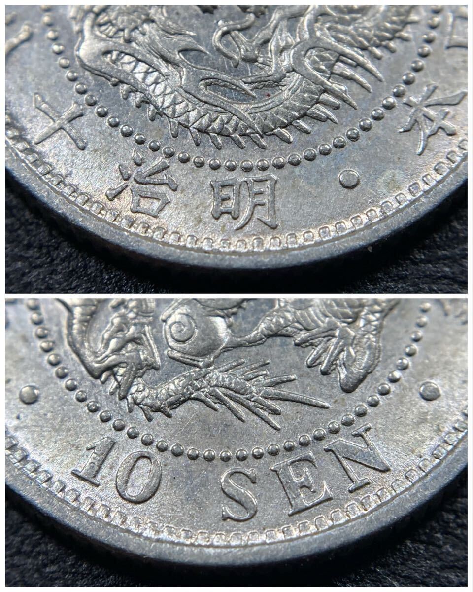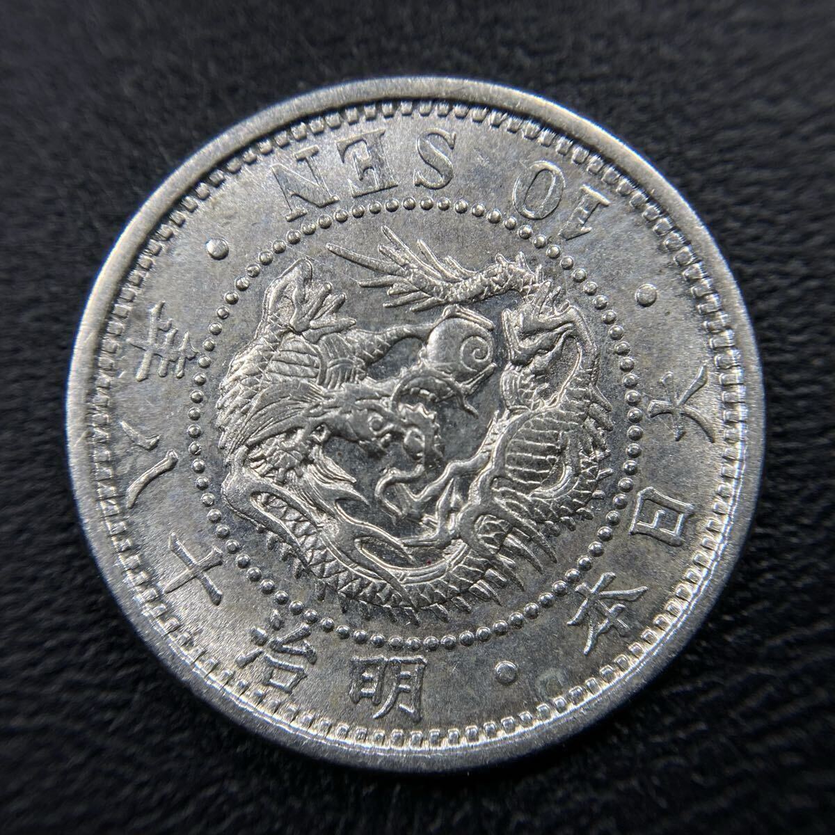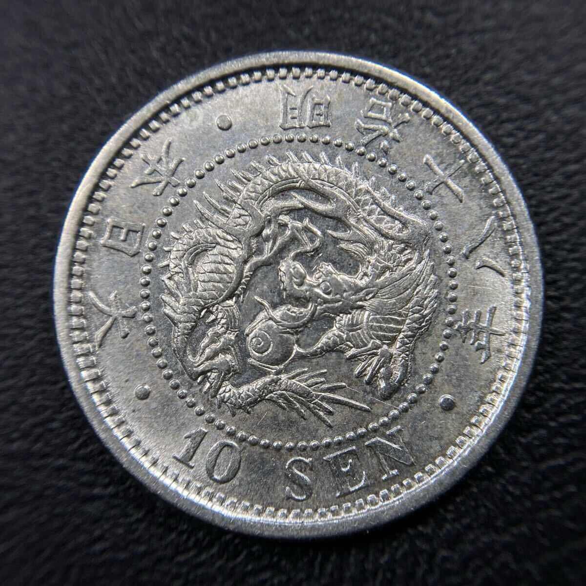 こちらは入手時未使用品の竜10銭銀貨の明治18年になります。