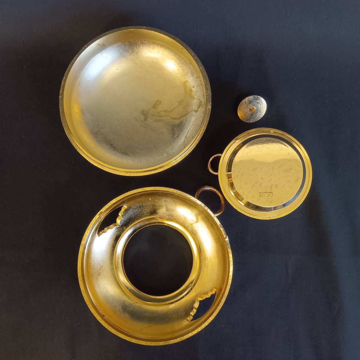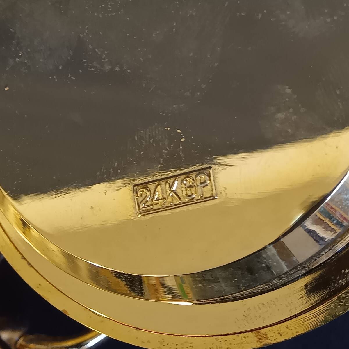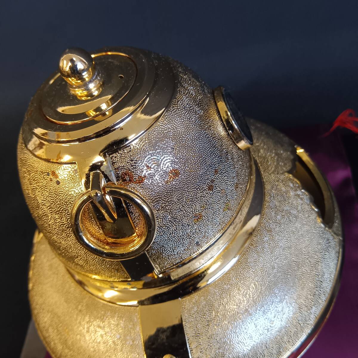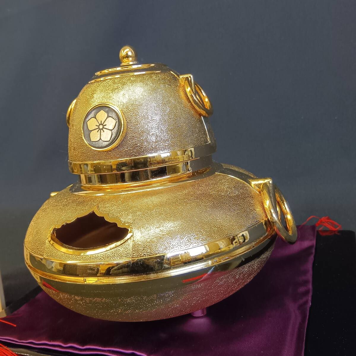本商品は、縁起物として人気の高い「開運 黄金茶釜」の置物です。底部には「24KGP」の刻印があり、24金で金メッキ(ゴールドプレート)が施された金属工芸品となります。文福茶釜をモチーフにした丸みを帯びた形状と、全体に施された金色の粒状の加工(梨地のような質感)が特徴的で、開運招福の願いが込められています。また、画像から蓋付きの茶釜型香炉としても使用できるタイプと推測されます。縁起の良い梅(または桜)のような家紋もデザインされており、床の間や玄関、リビングなどのインテリアとして、おめでたい雰囲気を演出します。財運・金運アップの縁起物としても大変好まれます。座布団や木札が付属しており、コレクション品としても、また、お祝い事や記念品として贈答されたものとしても価値のあるお品です。